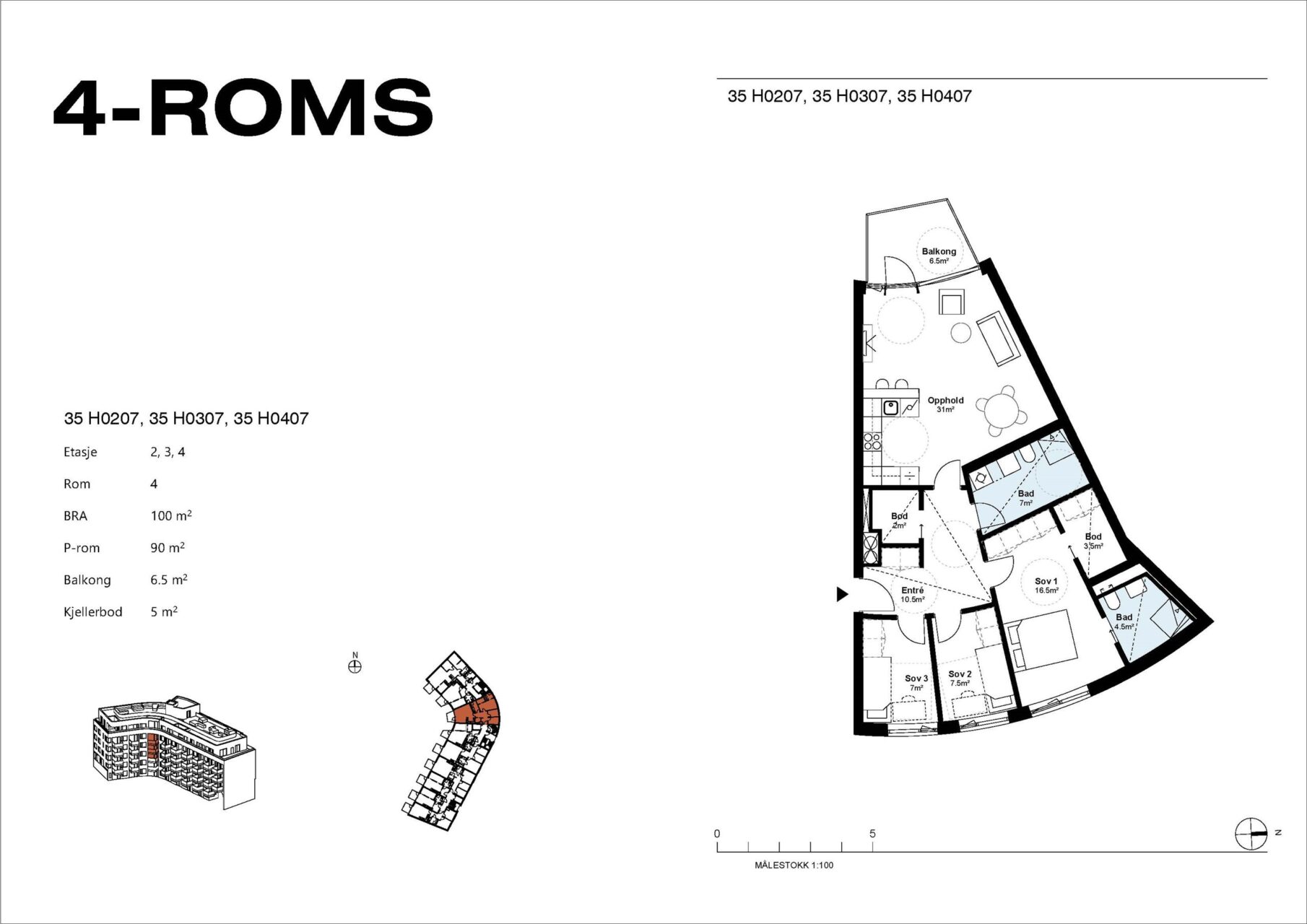 De oppgitte arealer er hentet fra opprinnelige plantegninger fra utbygger. Vedlagte plantegninger er ikke målbare. Arealet er beregnet ut fra Norsk standard NS 3940:2023. BRA-i: Internt arealet innenfor boligens omsluttende vegger, inkludert sjakt. BRA-e: Eksternt areal som boligen har eksklusiv bruksrett til, men som ikke ligger i boligen, f.eks. kjellerbod. BRA-b: Areal for innglasset balkong med veggareal. Total BRA = Summen av BRA-i, BRA-e og BRA-b. TBA er areal på terrasse og balkong. Arealet oppgis ved salg, men inngår ikke i BRA. Oppgitt romareal er netto romareal. De oppgitte arealer er å betrakte som cirka-arealer. Partene har ingen krav mot hverandre dersom arealet skulle vise seg å være 5 % mindre / større enn det oppgitte areal.