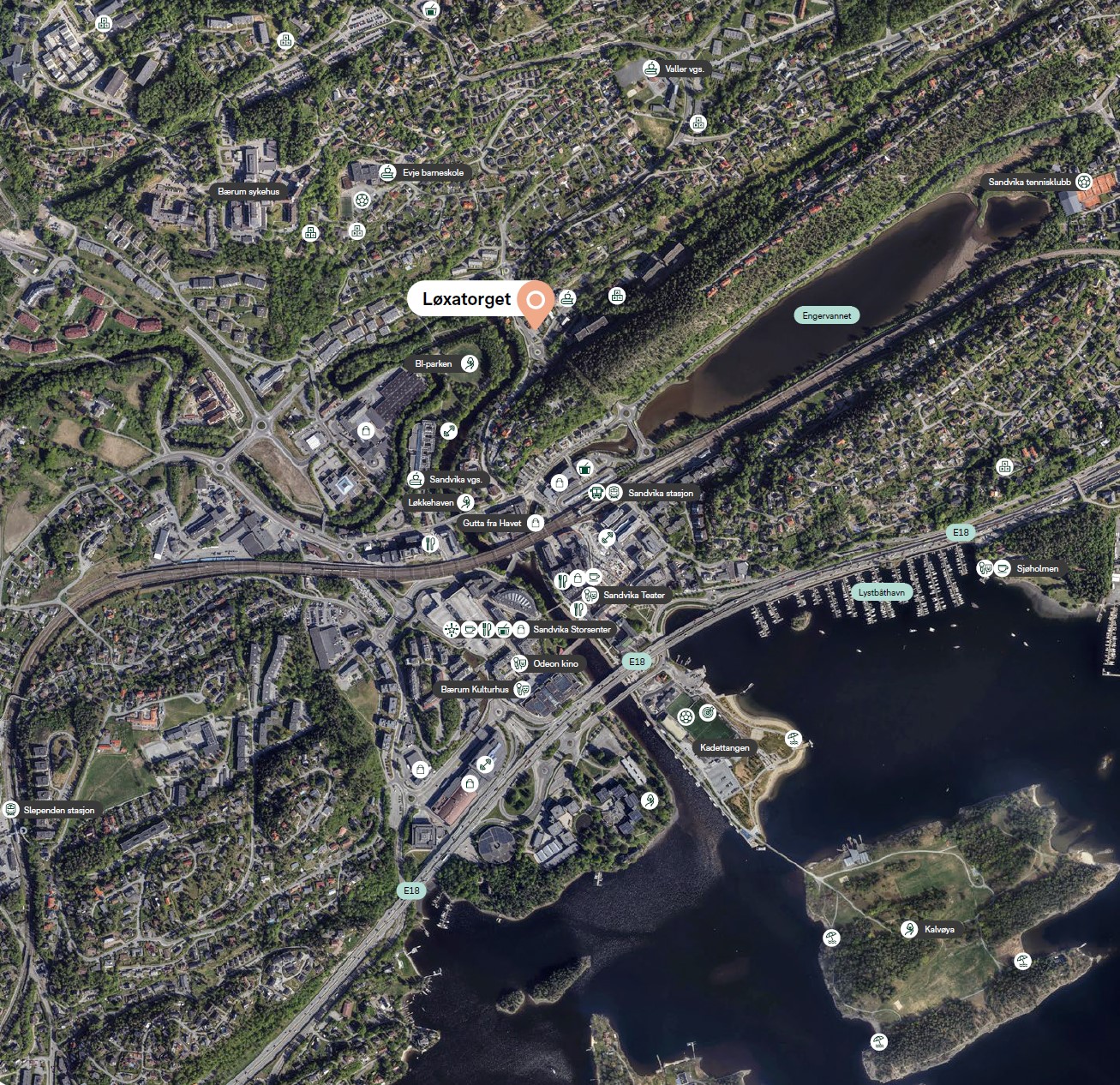 Livet på Løxatorget i Sandvika er tilrettelagt for at du skal få en enkel hverdag. Her bor du åtte minutters rusletur langs elven til Sandvika sentrum. Utvalget av spisesteder er variert, fra «fine dining» til mer tradisjonelle familiesteder som Egon og McDonalds. Ta en is i sommervarmen eller bare sett deg ned langs elvepromenaden for å se på folkelivet med litt kald drikke en varm sommerdag. Tar du turen ut til Kadettangen, finner du en fantastisk badestrand og et nytt stupetårn for den mer vågale. Herfra går gangbroen videre over til Kalvøya med sine fine badeviker og populære turområder.