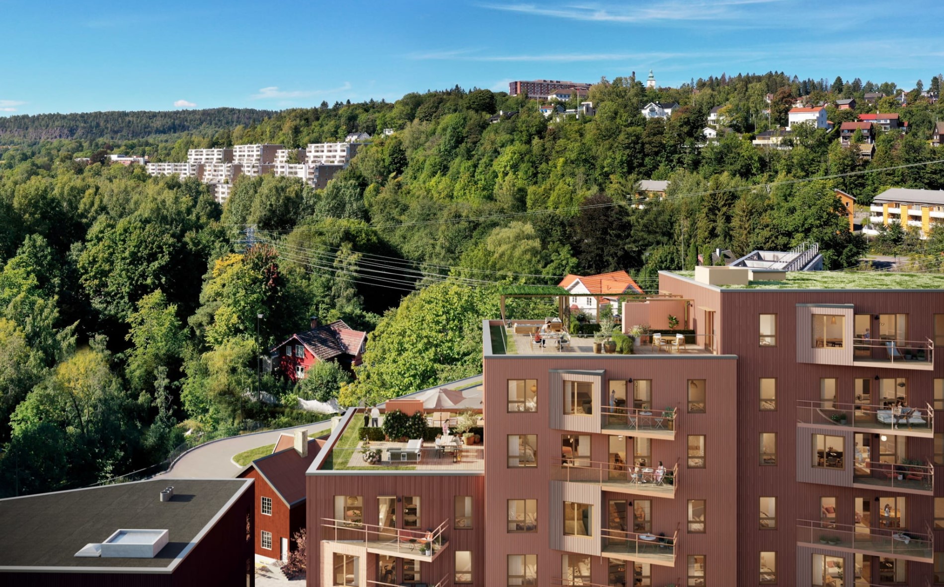 Felles takterrasse, plassert på taket av Hus 2, inngår som fellesareal og kan benyttes av alle beboere i Sameiet. Takterrassen vil bestå av felles sone med pergola, avslapningssoner og beplantning.