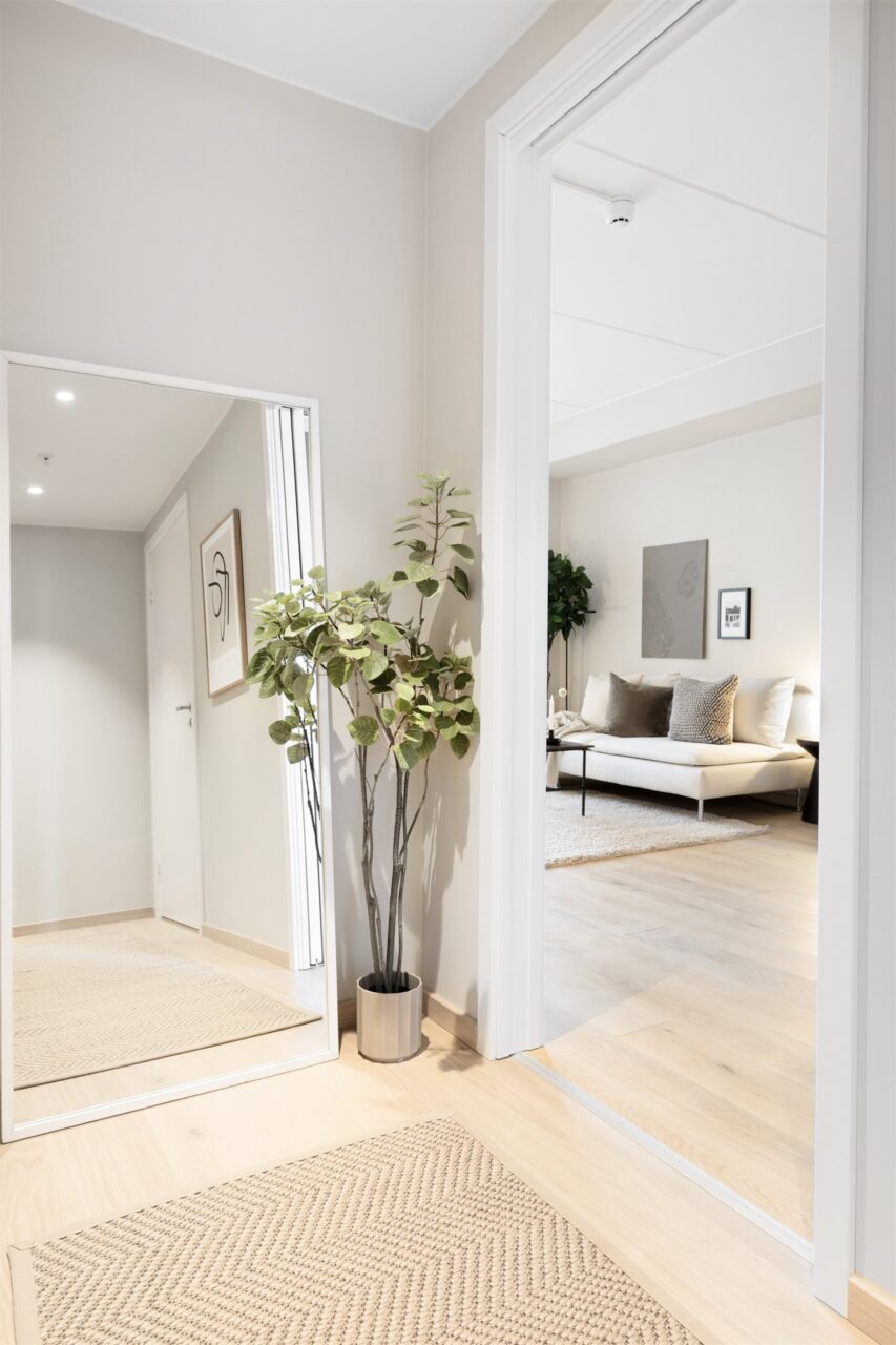Når man kommer inn i leiligheten møtes man av en lys entré/gang på ca. 6,9 m². Det er en pen 1-stavs eikeparkett på gulv, og downlights i himling.