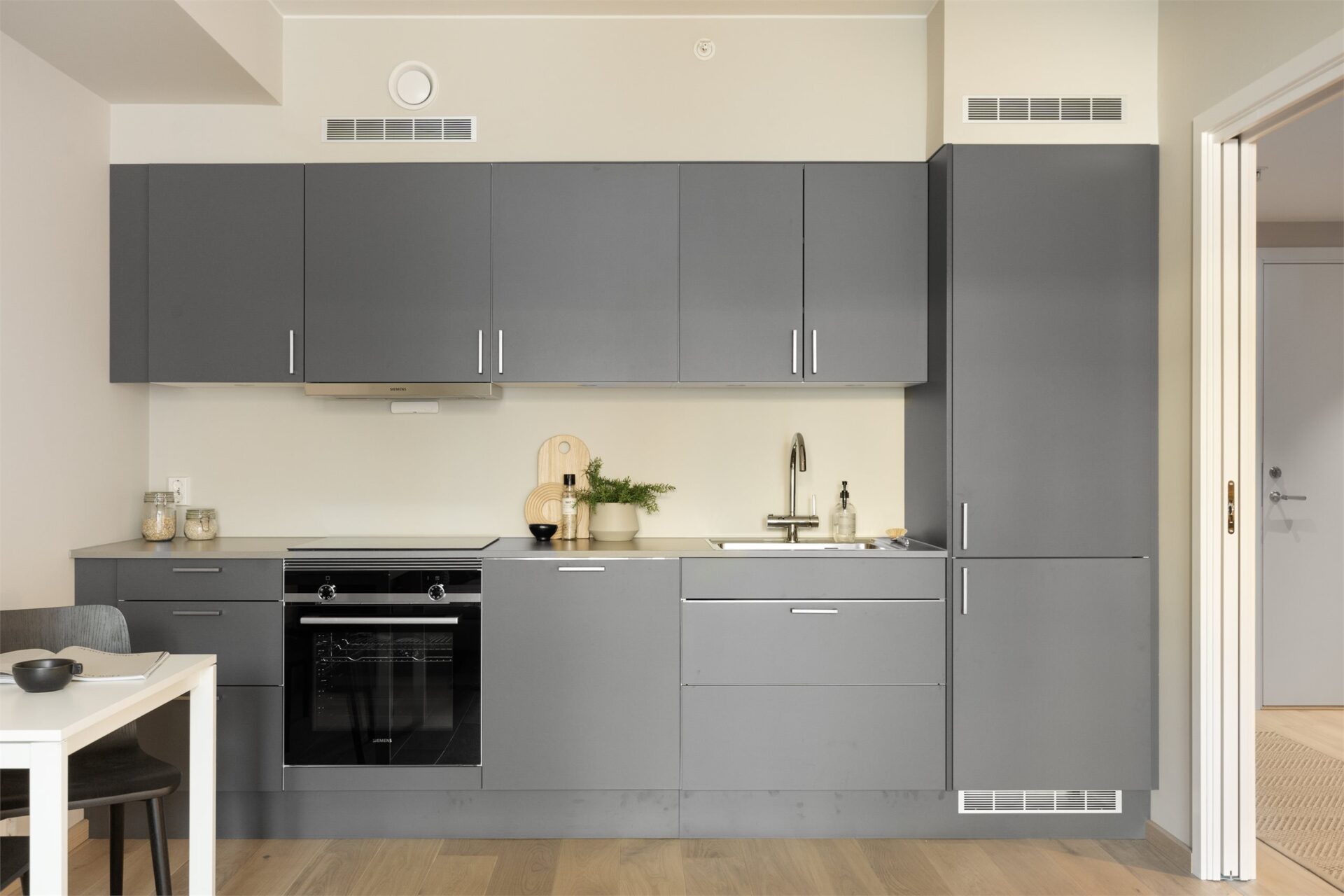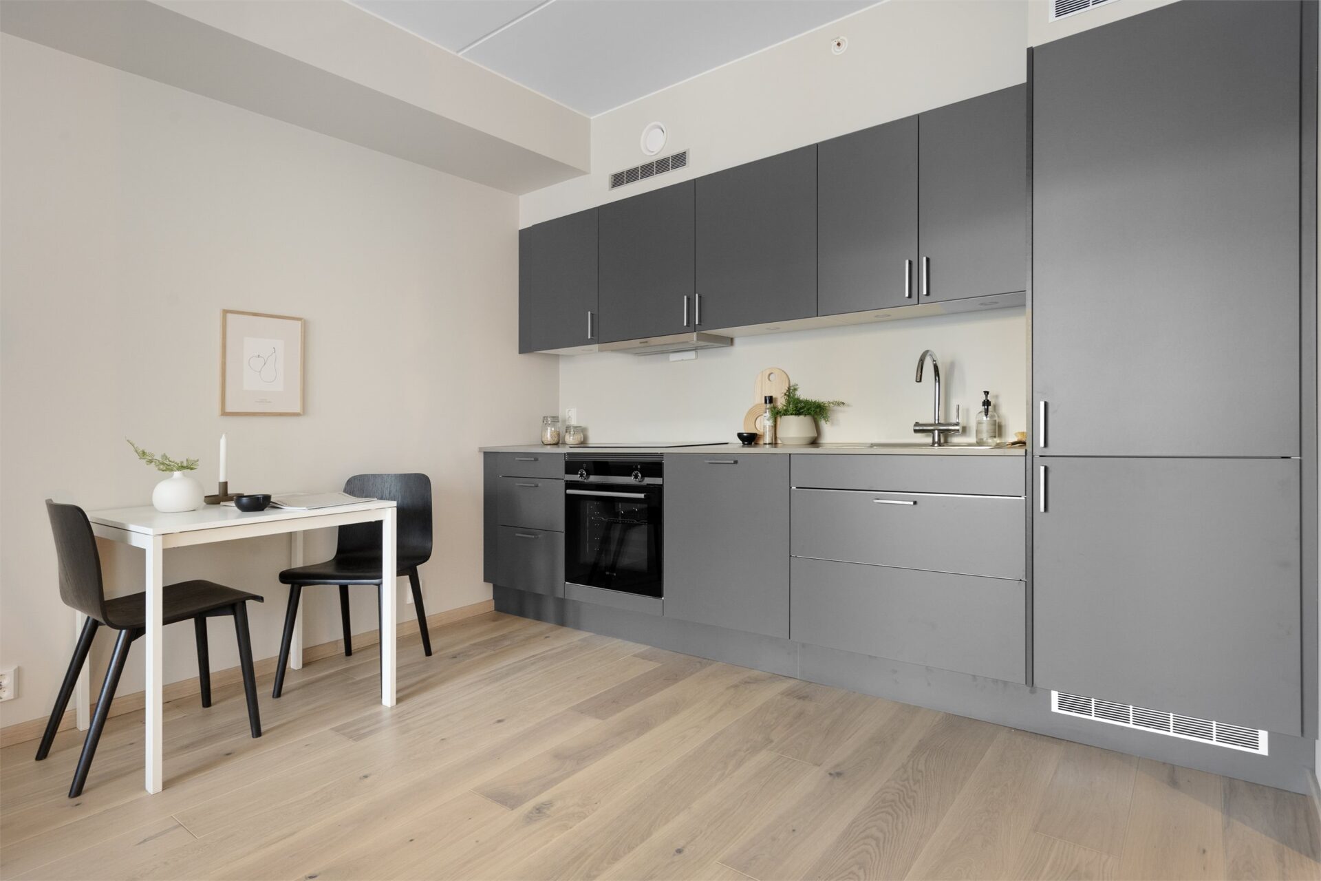 Det er et stilrent kjøkken med integrerte hvitevarer som stekeovn, induksjonstopp, oppvaskmaskin og kombiskap (kjøl/frys).