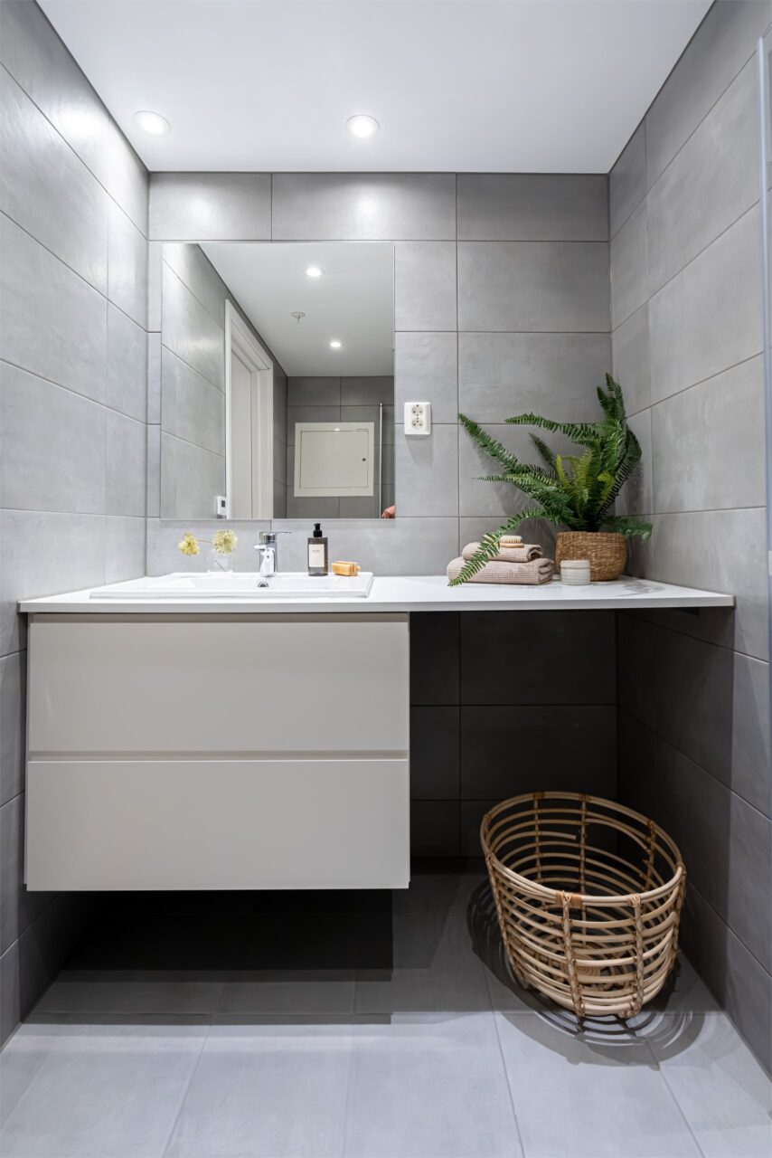 Leiligheten har et innbydende bad på ca. 3,3 m², som har en lys og varm farge som gir badet et tidløst utseende.