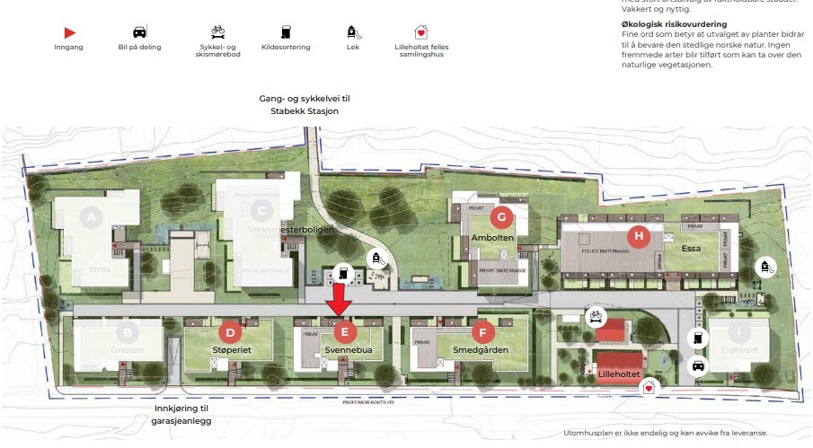 Tomten vil bli et fellesareal for sameiet/sameiene, med unntak av deler som eventuelt vil tillegges til den enkelte seksjon. Det er regulert en offentlig turvei på tvers av tomten som skal opparbeides av utbygger, men skal overtas av Bærum kommune etter ferdigstillelse.