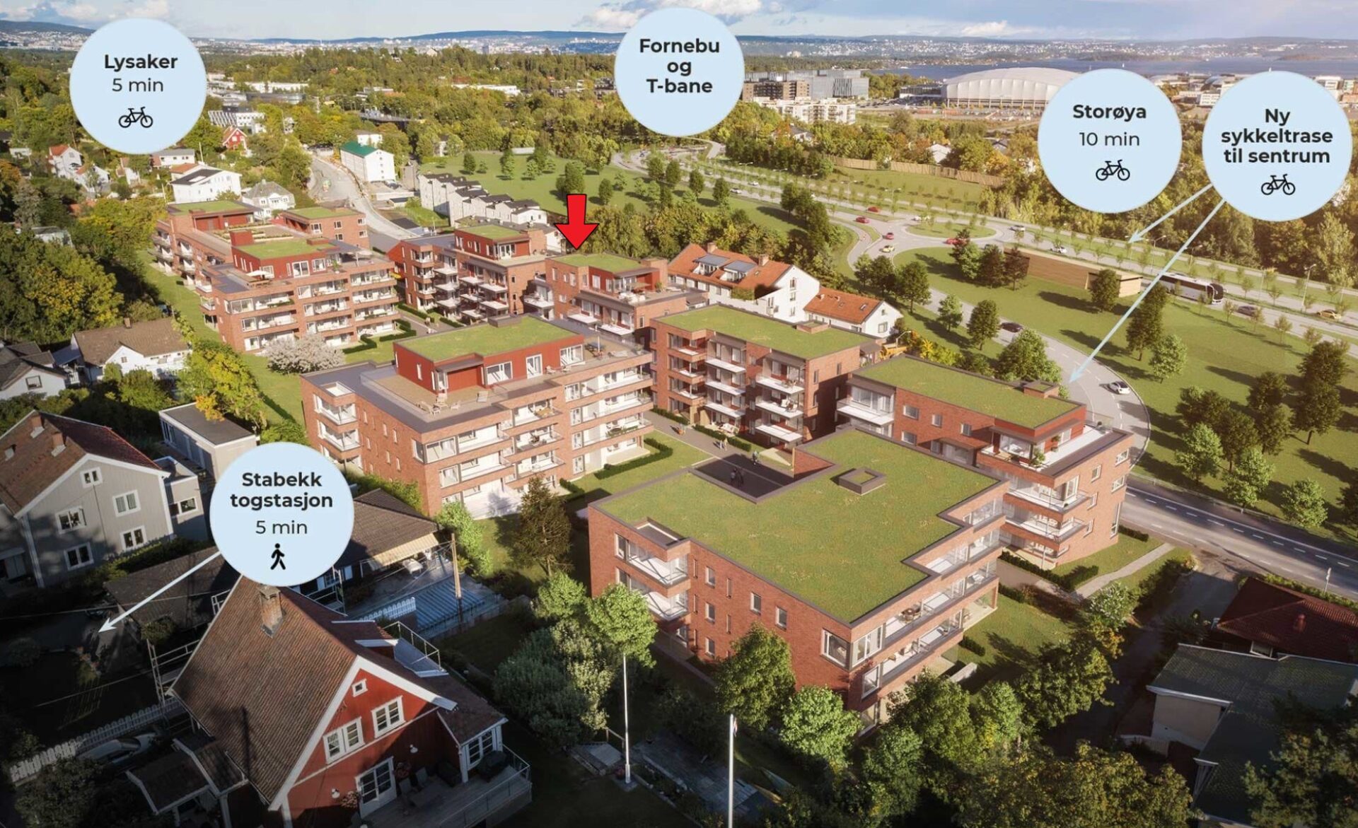 og man trenger på ingen måte å ikle seg pulsklokke og klikksko for å sykle på jobben. Sykkelen parkeres enkelt foran inngangen til boligene eller tørt og fint i garasjeanlegget, hvor det også blir egne stikkontakter for lading av elsykler.