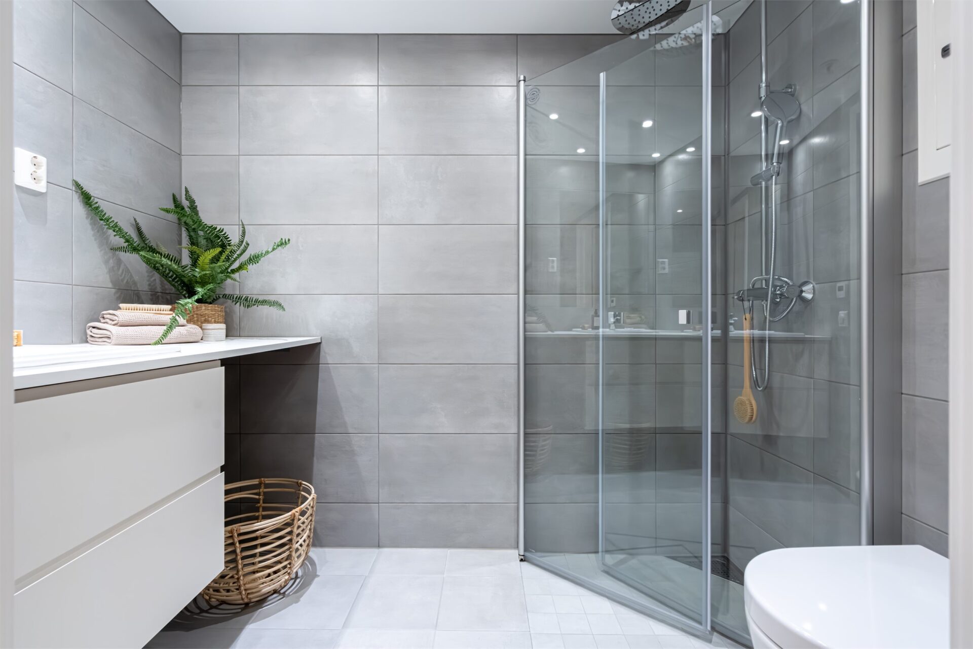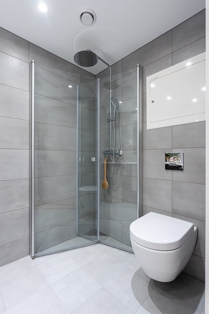 Regnfalls dusj med svingbare dører.