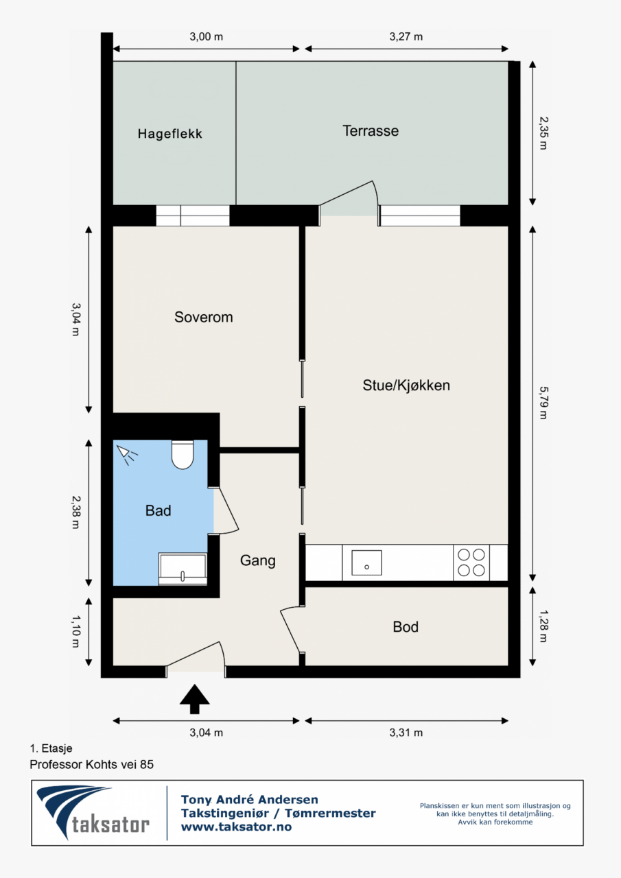 De oppgitte arealer er hentet fra takstmanns arealoppmåling. I arealoppstillingen er alle arealer avrundet til nærmeste hele tall. Arealet er beregnet ut fra Norsk standard NS 3940:2023. BRA-i: Internt arealet innenfor boligens omsluttende vegger, inkludert sjakt. BRA-e: Eksternt areal som boligen har eksklusiv bruksrett til, men som ikke ligger i boligen, f.eks. kjellerbod. BRA-b: Areal for innglasset balkong med veggareal. Total BRA = Summen av BRA-i, BRA-e og BRA-b. TBA er areal på terrasse og balkong. Arealet oppgis ved salg, men inngår ikke i BRA. Oppgitt romareal er netto romareal.