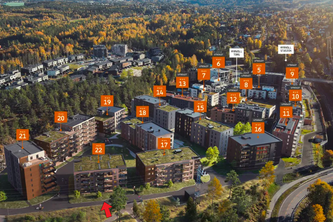 Dette er et salg av kontraktsposisjon vedrørende leilighet 22-0105 i Prosjektet Myrvoll Stasjon. Leiligheten er en del av Hus 22 i Skogbrynkvartalet som vil bestå av 24 leiligheter. Leiligheten har en nordvestvendt markterrasse på ca. 14,5 m². Kort vei unna ligger Myrvoll torg med dagligvare, baker og andre servicetilbud. Det er nærhet til togstasjonen som kun bruker 24 minutter inn til Oslo S.