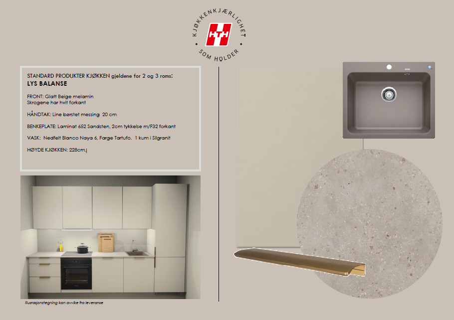 Standard leveranse for interiørkonsept er «Lys Balanse», og er valgt i denne leiligheten. Dette er et konsept som kombinerer tidløs eleganse med en naturlig ro. Med lyse beige toner som grunnlag, skapes et harmonisk uttrykk der balanse mellom lys og varme står i sentrum. Konseptet henter inspirasjon fra naturens egne nyanser og fokuserer på myke teksturer, rene linjer og subtile kontraster, som gir rommene en følelse av letthet og harmoni. Lys Balanse er mer enn en stil – det er en invitasjon til å skape et hjem fylt med ro, varme og skjønnhet.