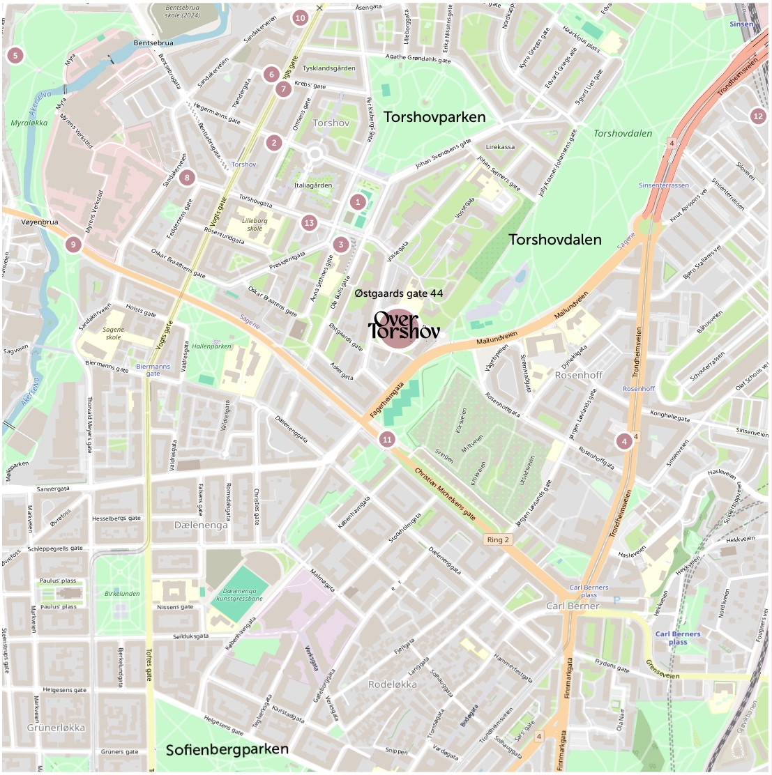 Østgaards gate 44 ligger like ved vakre Torshovdalen. Torshovdalen er kjent for sine grønne lunger og fantastiske utsikt. Her finner man også turstier, lekeplasser og rikelig med plass for piknik, trening og avslapning. I tillegg er det et bredt utvalg av kaféer, restauranter og butikker bare noen minutter unna, samt enkel tilgang til både buss og trikk.