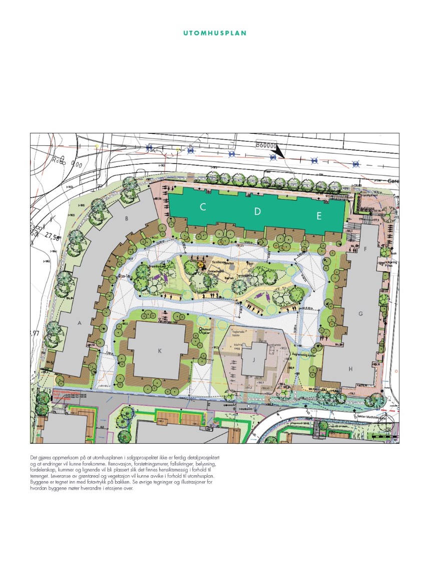 Tomten blir opparbeidet med blant annet gressplen, beplantning, gangveier, lekeplass og utomhusarealer med utstyr iht. utomhusplanen. Endelig detaljprosjektering og/eller myndighetskrav vil kunne medføre enkelte endringer på utomhusplanen.