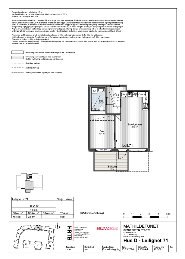 Arealbeskrivelse: Alle arealer er hentet fra Utbyggers plantegning. Arealet er beregnet ut fra Norsk standard NS 3940:2023. BRA-i: Internt arealet innenfor boligens omsluttende vegger, inkludert sjakt. BRA-e: Eksternt areal som boligen har eksklusiv bruksrett til, men som ikke ligger i boligen, f.eks. kjellerbod. BRA-b: Areal for innglasset balkong med veggareal. Total BRA = Summen av BRA-i, BRA-e og BRA-b. TBA er areal på terrasse og balkong. Arealet oppgis ved salg, men inngår ikke i BRA. Oppgitt romareal er netto romareal. De oppgitte arealer er å betrakte som cirka-arealer. Partene har ingen krav mot hverandre dersom arealet skulle vise seg å være 5 % mindre / større enn det oppgitte areal.