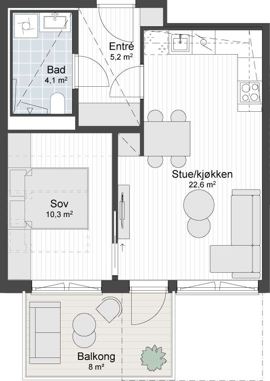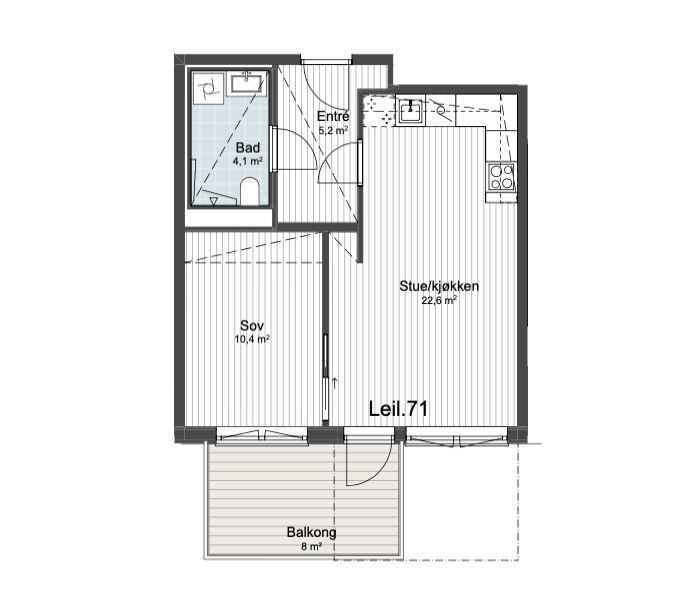 – Skyvedørsfronter og garderober er stiplet inn i salgstegningene for å vise mulig plassering, og er ikke en del av leveransen.