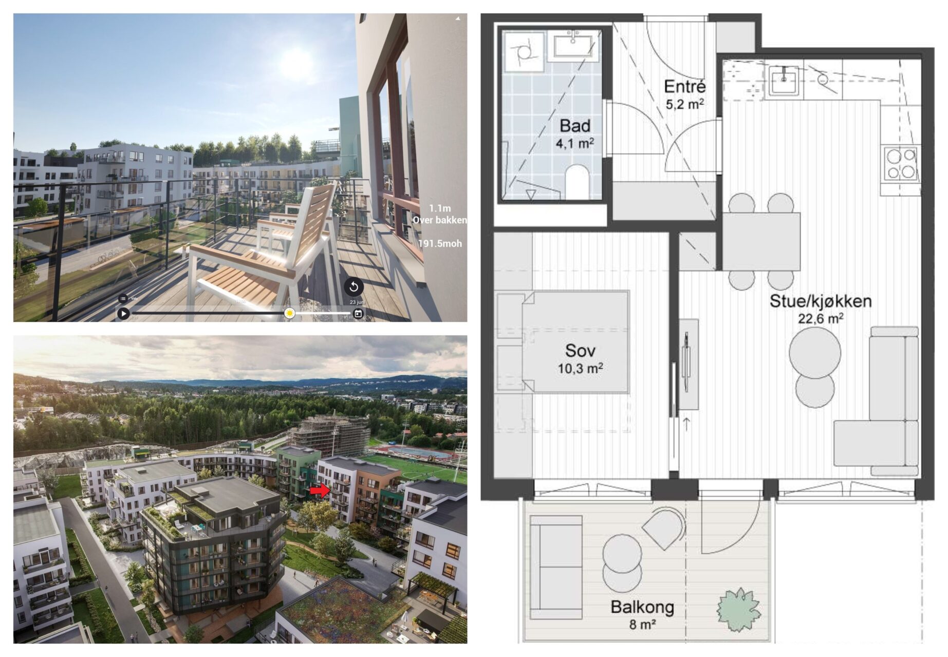 Det gjøres oppmerksom på at balkongrekkverk kan bli noe annerledes enn vist på tegninger og 3D-illustrasjoner. På noen leiligheter kan rekkverk leveres med horisontale spiler og/eller glassrekkverk.