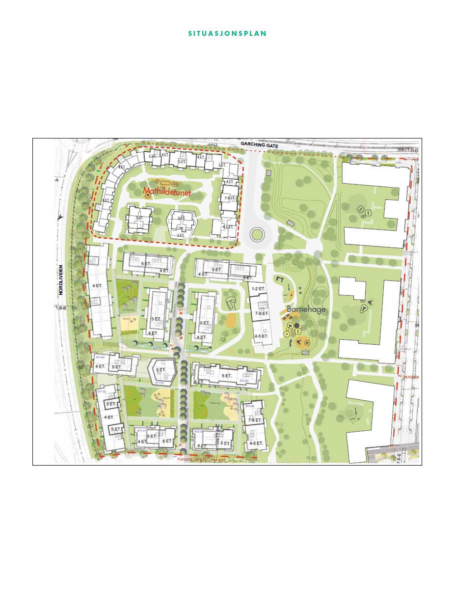 Hele Mathildetunet planlegges med 195 leiligheter fordelt på 10 hus.