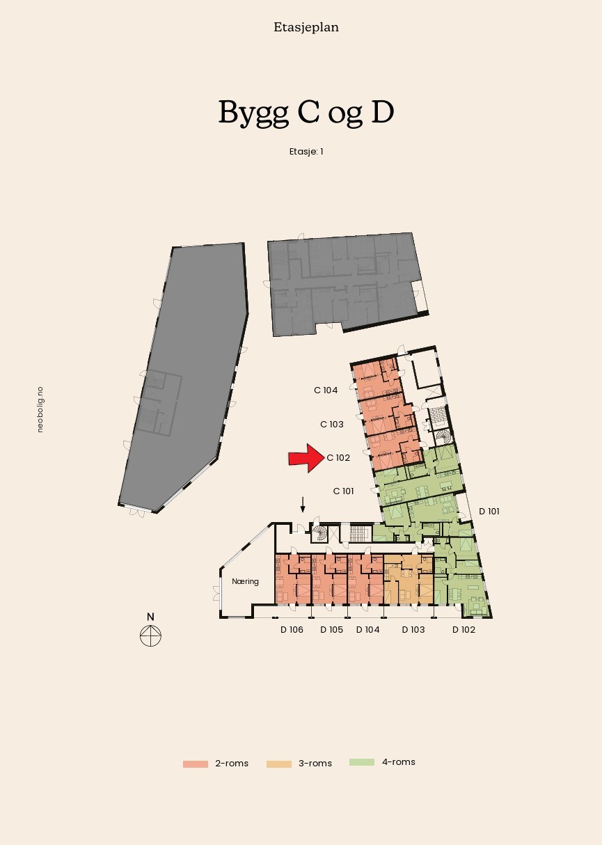 Dette er et salg av en kontraktsposisjon vedrørende leilighet C-102 i prosjektet Neo. En arealeffektiv 2-roms selveierleilighet med sørvestvendt markterrasse. Prosjektet Neo ligger sentralt til ved Ås stasjon. Byggene blir formet som en hestesko med en trivelig bakgård med gress, benker, planter, trær og lekeapparater. Det er gode bussforbindelser til andre deler av distriktet, og togstasjonen ligger et stenkast unna. Derfra er du på Oslo S i løpet av 19 minutter.