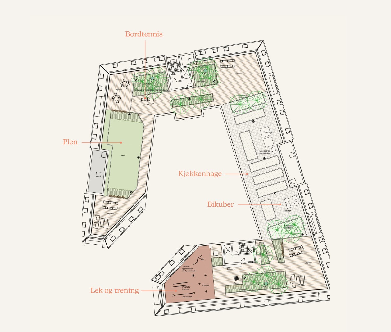 Neo blir formet som en hestesko med en trivelig bakgård med gress, benker, planter, trær og lekeapparater. Et fabelaktig alternativ når vinden blåser på taket og stillerommet blir for stille. Uteområdet rundt NEO blir også en verdifull kvalitet. Trær, gress busker og stier som gjør det lett å ta seg en kort rusletur. På gateplan blir det butikker, og vi håper at det minste forretningslokalet kan bli en «intern» kafé for beboere og nærområdet – enda et møtested for gode naboer.
