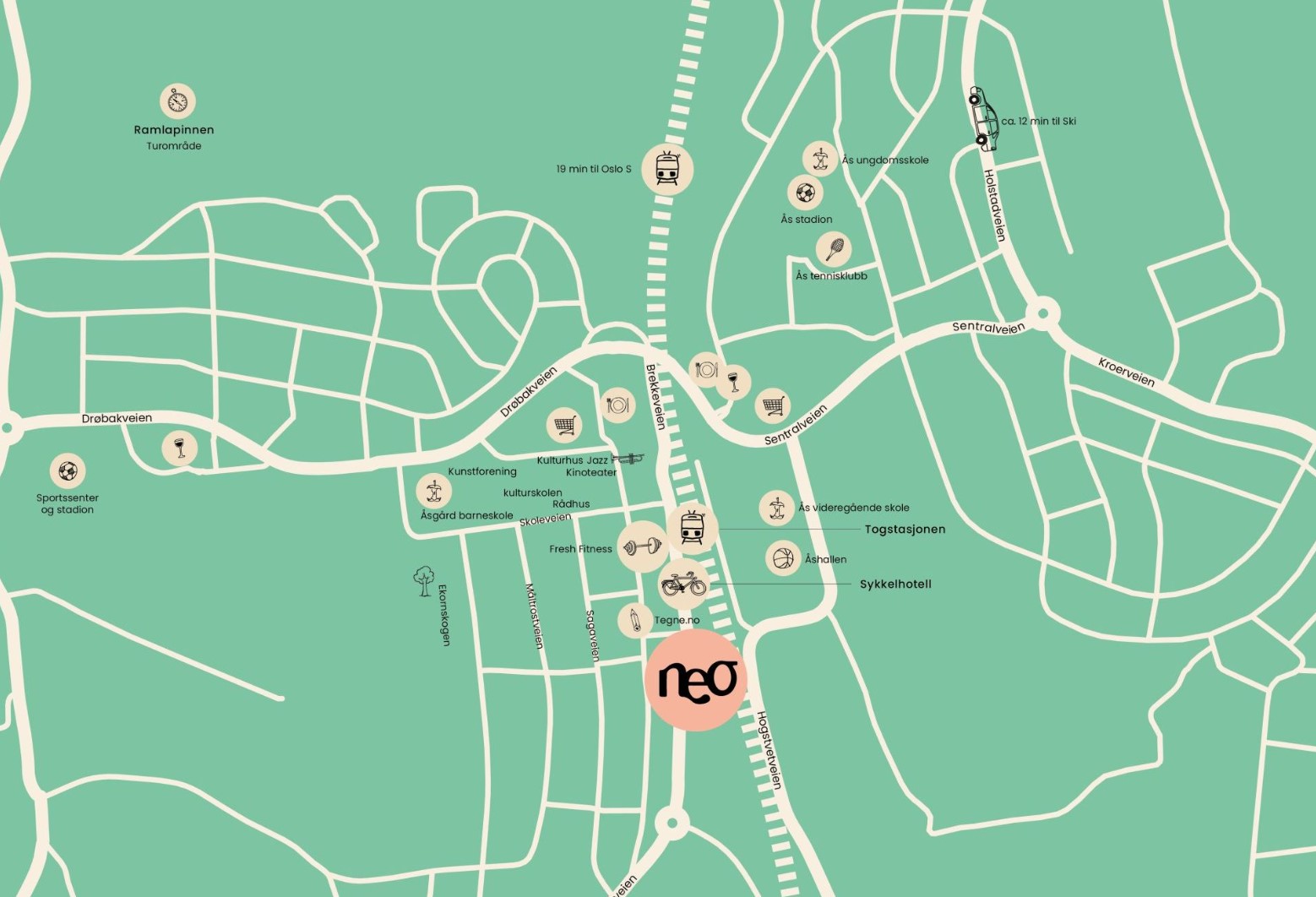 125 leiligheter fordelt på fem etasjer, utført i en arkitektur som både henter inspirasjon fra klassiske industribygg og bygårder fra forrige århundreskifte. Utbygde nisjer i fasaden og skråtak vil gi Neo en tydelig personlighet. Et hjem med karakter er fint, i Neo får du det i massevis. Det blir en fin miks av små og litt større leiligheter, med fokus på effektive, kompakte hjem. Det er mange unge mennesker som kommer til Ås og blir der over tid, de har verken bruk for eller ressurser til store boliger i denne perioden. Neo blir likevel et sted med plass til alle, det blir også større, romslige enheter for godt etablerte mennesker som ønsker å nyte de helt spesielle kvalitetene Ås sentrum har å by på. NEO skal være et fint, smart og hyggelig alternativ. Uansett hvor i livet du befinner deg.