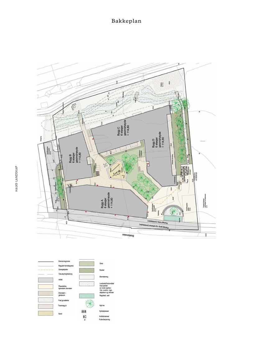 Endelig utomhusplan er ikke ferdigbehandlet og er foreløpig utarbeidet for illustrasjon. Utbygger forbeholder seg her retten til å bestemme endelig utforming og materialvalg. Uteareal vil bli ferdigstilt i den grad det er mulig i forhold til årstid og vil bli tilpasset videre utbygging av området.