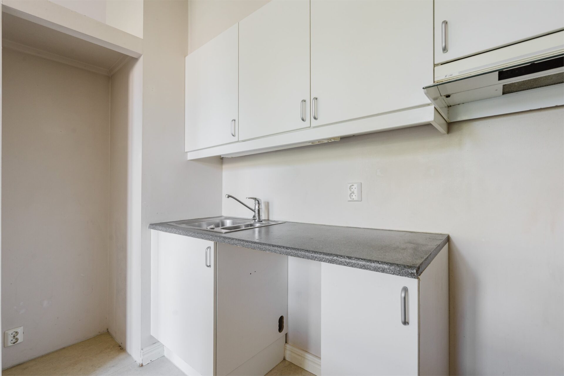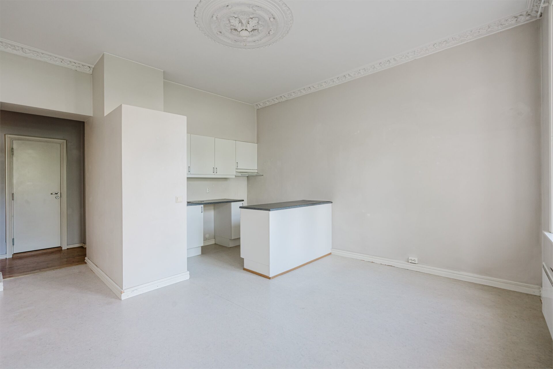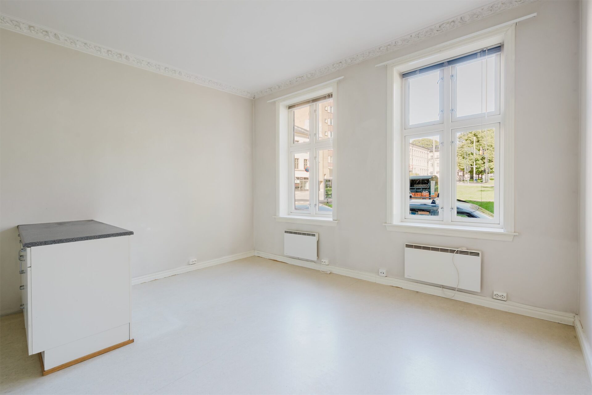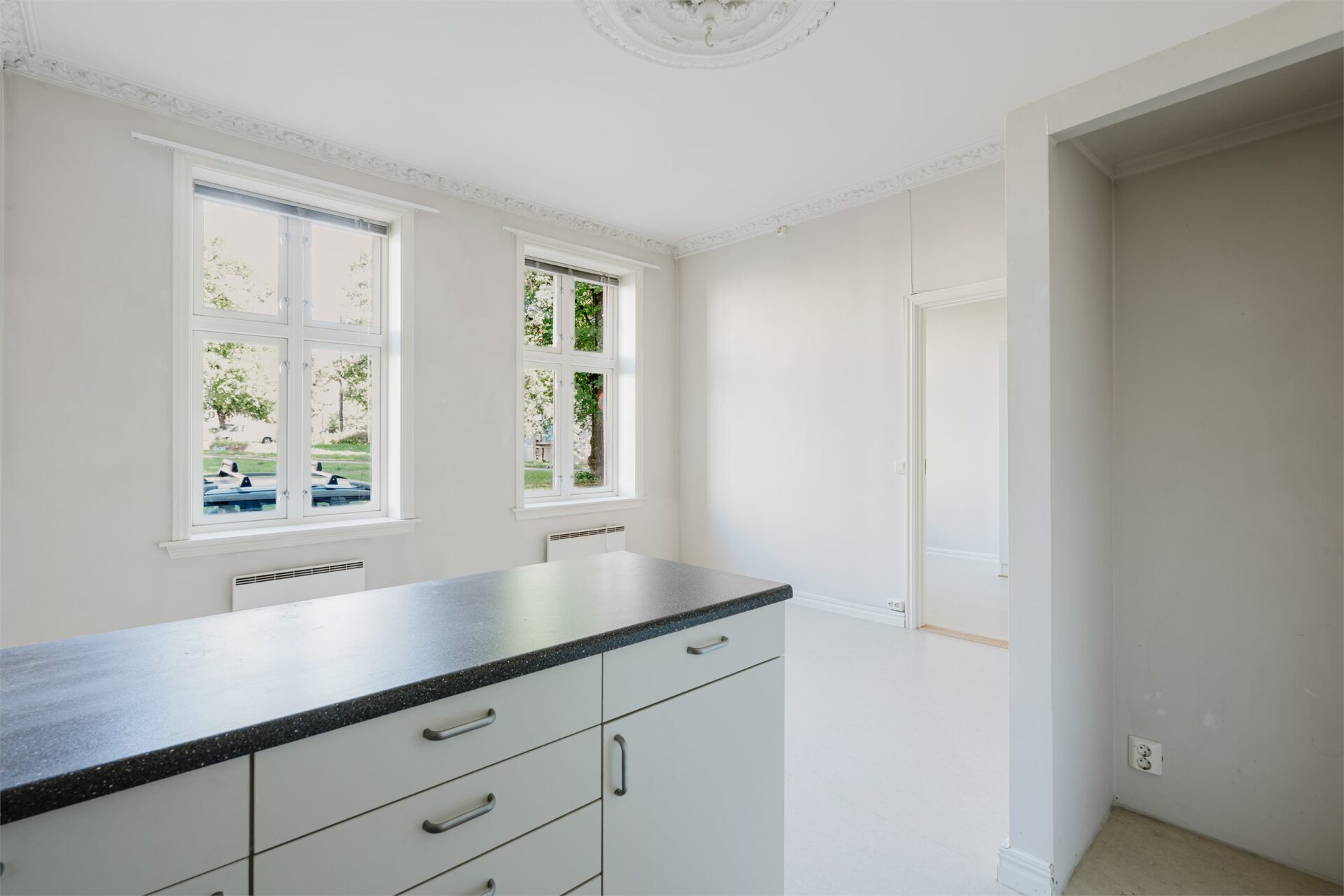 I stuen er den lyse atmosfæren spesielt merkbar, først og fremst på grunn av flere vinduer som slipper gode mengder dagslys inn i rommet. Det er verdt å nevne takhøyde på rundt 2,9m i stuen. Rommet har klassiske detaljer som rosett og stukkatur. Stuen er enkel å innrede med møbelgrupper som en sofa, mediemøbel og et spisebord. Det er åpen kjøkkenløsning, hvor kjøkkenet har hvite fronter og laminat benkeplate. Det medfølger ikke hvitevarer på kjøkkenet. Kjøkkenventilator med mekanisk avtrekk som ledes ut av bygget. Ventilatoren styrer avtrekket på kjøkken og bad. Kjøkkenet er modent for modernisering.