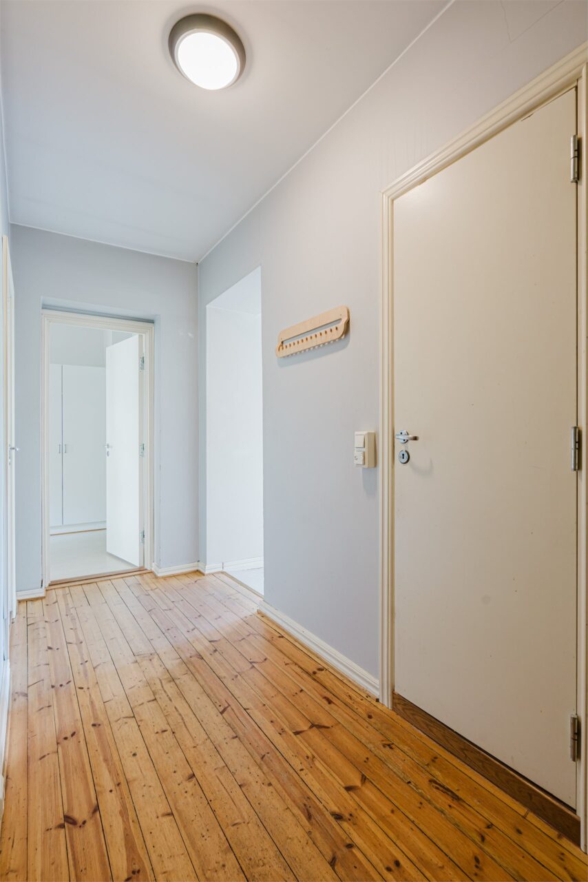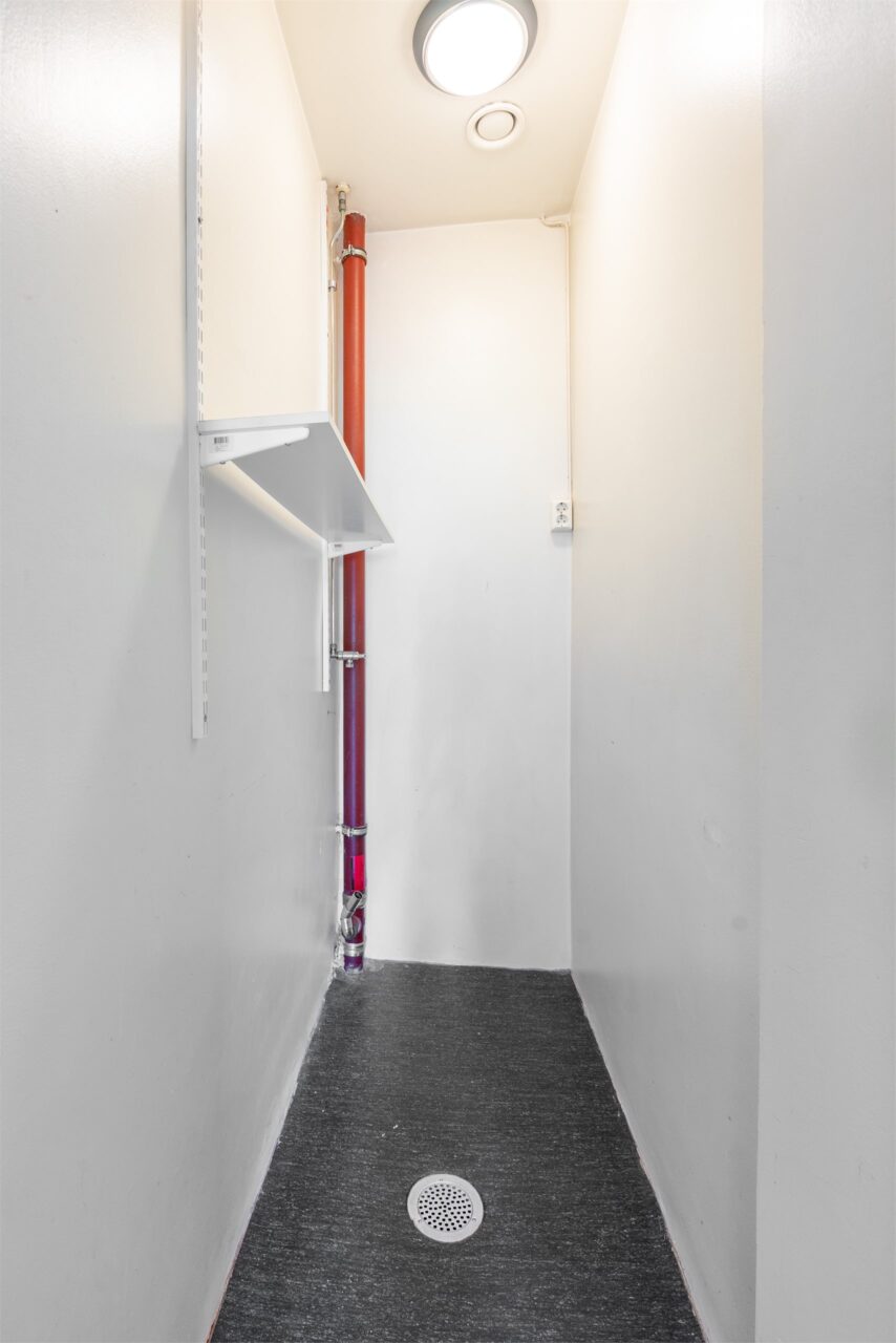 Innenfor døren møtes man av en lys gang. I tilknytning til gangen er det en innvendig bod/kott med sluk, som har plass til vaskemaskin.