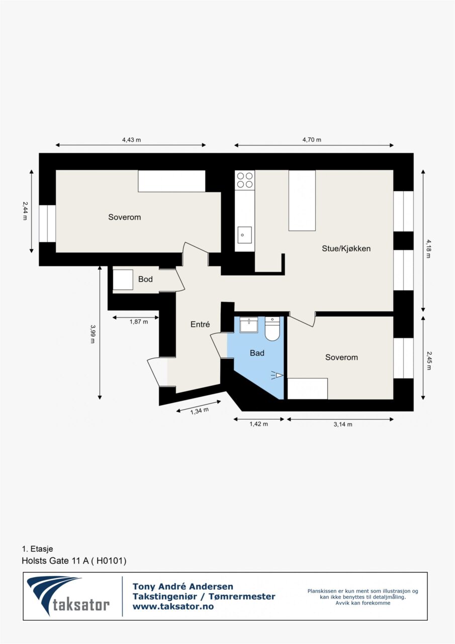 De oppgitte arealer er hentet fra tilstandsrapport datert 21.08.2025 utført av Tony Andersen. Arealet er beregnet ut fra Norsk standard NS 3940:2023. BRA-i: Internt arealet innenfor boligens omsluttende vegger, inkludert sjakt. BRA-e: Eksternt areal som boligen har eksklusiv bruksrett til, men som ikke ligger i boligen, f.eks. kjellerbod. BRA-b: Areal for innglasset balkong med veggareal. Total BRA = Summen av BRA-i, BRA-e og BRA-b. TBA er areal på terrasse og balkong. Arealet oppgis ved salg, men inngår ikke i BRA. Oppgitt romareal er netto romareal. De oppgitte arealer er å betrakte som cirka-arealer.
