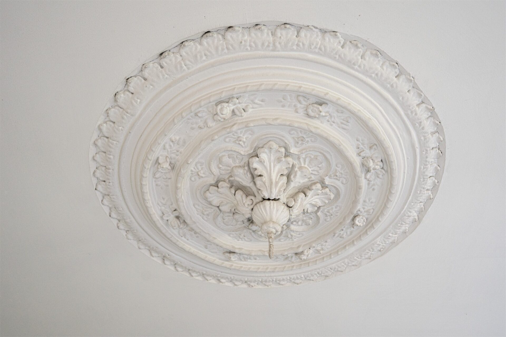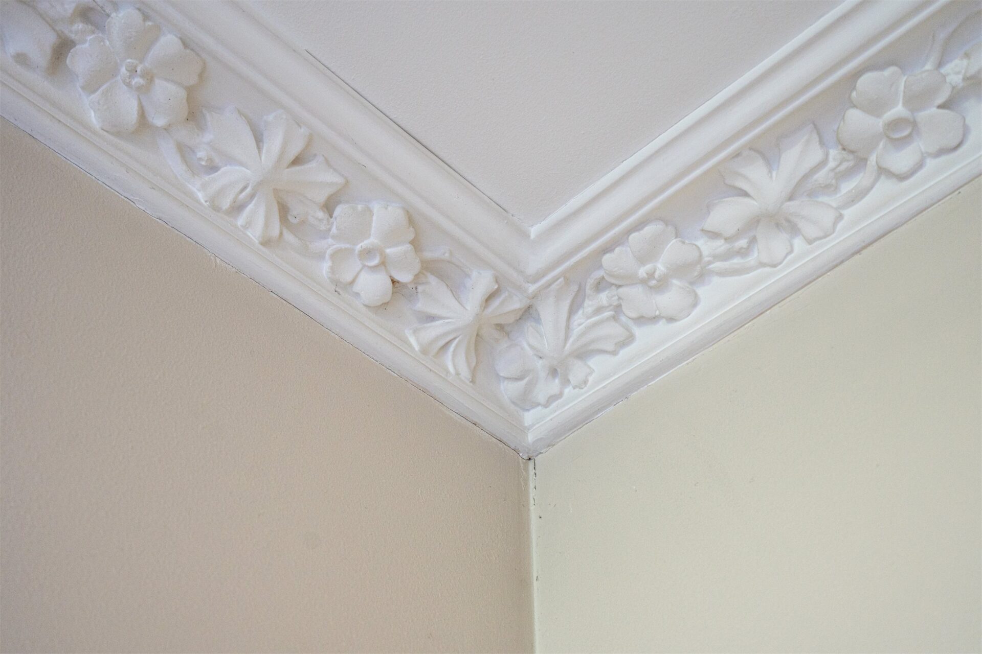 Hakk og riper i parkettgulv. Svelleskader i listverk. Sprekk i puss.