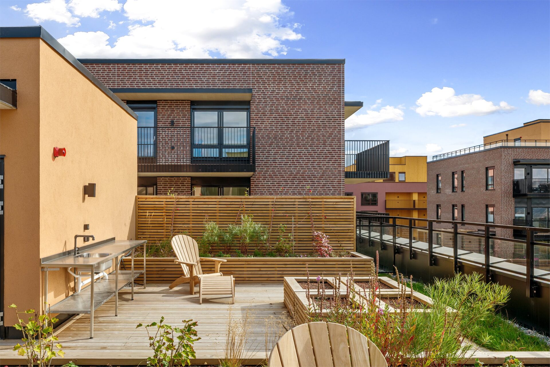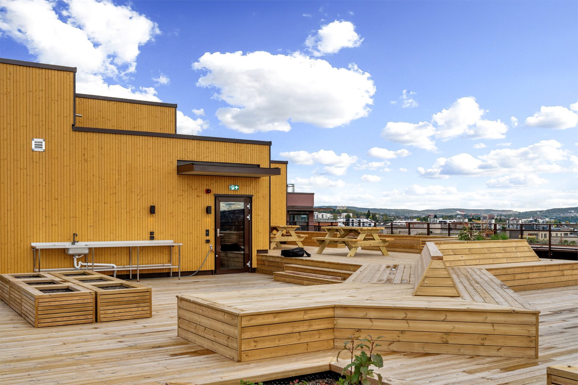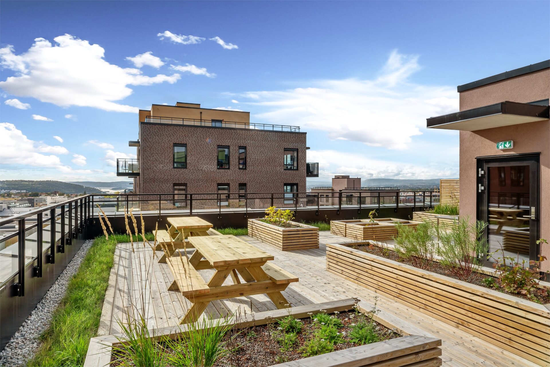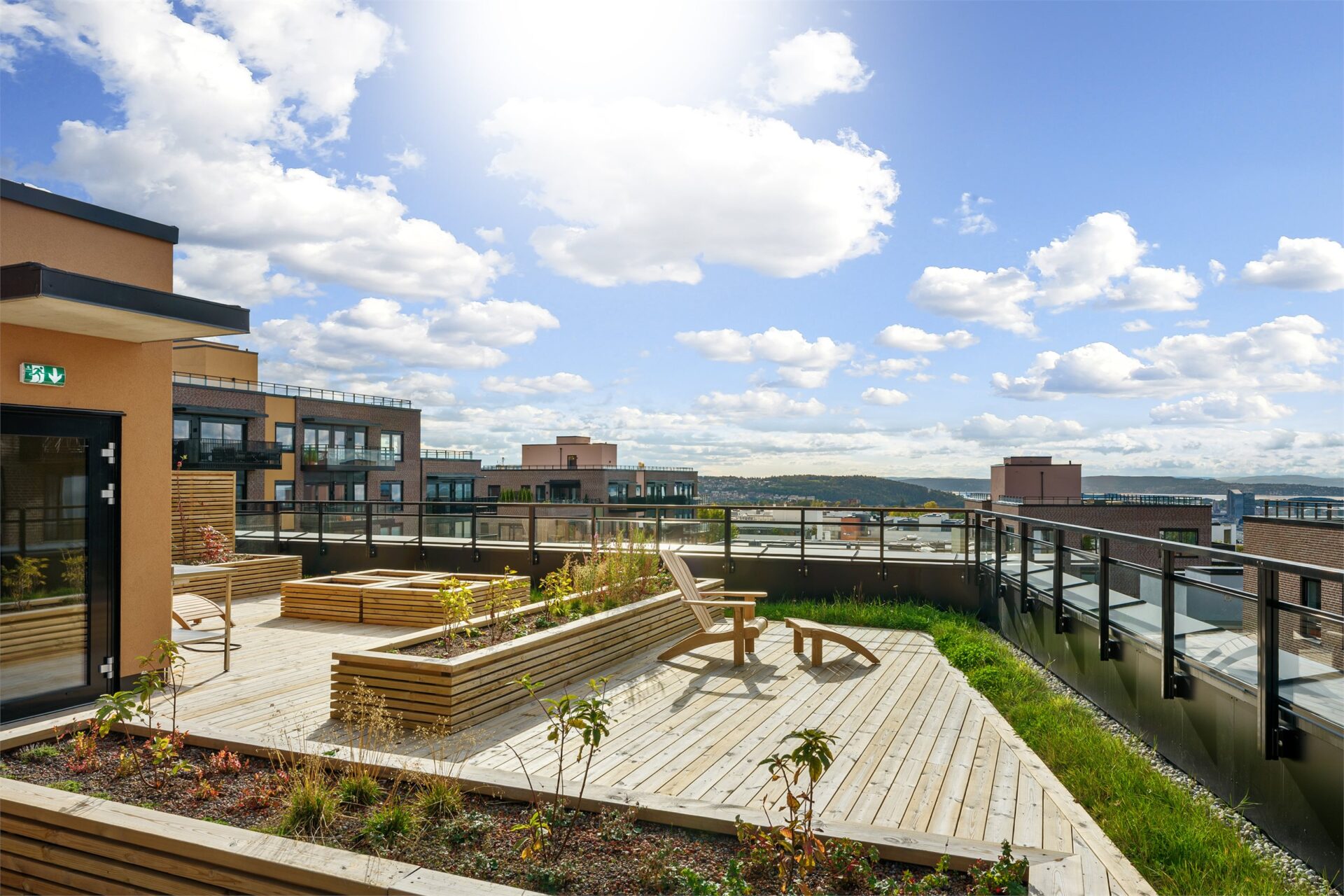 På taket planlegges det en møblert og grønn takterrasse som beboerne har delt tilgang til. Her kan du invitere gjester, kose deg alene i solen eller treffe gode naboer over en kaffekopp. Takterrassene er ikke endelig prosjektert, endringer vil kunne forekomme.