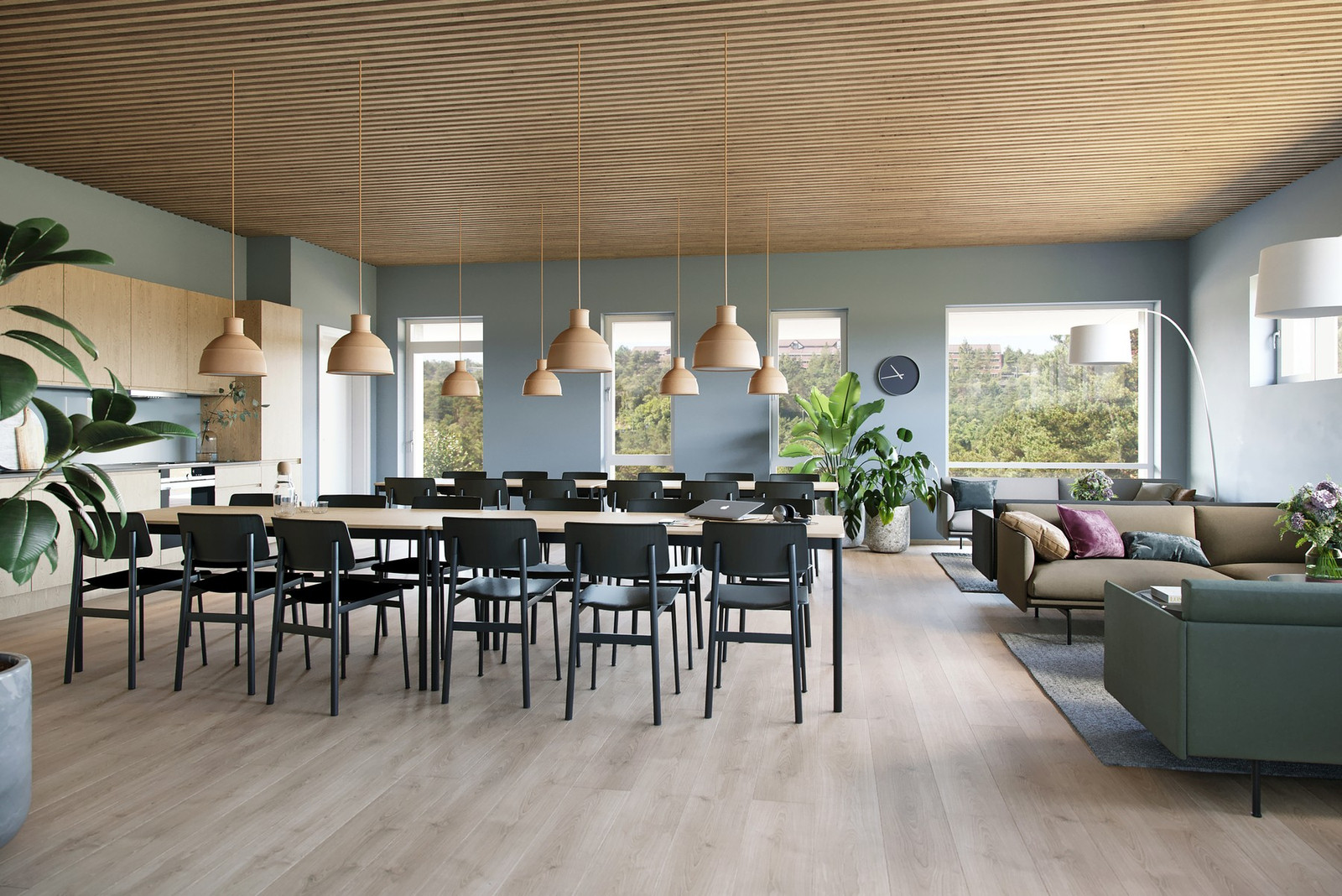 I fremtidige hus B er det planlagt et praktisk fellesområde med møterom, arbeidsplasser, sosial sone og selskapsrom med kjøkken. Arealene tilrettelegger for godt og aktivt naboskap, og kan leies for private arrangement. I tillegg planlegges det to gjesterom, som beboerne kan leie når antall gjester overstiger antall soverom i leiligheten! Fellesområdene er ikke endelig prosjektert, endringer vil kunne forekomme.