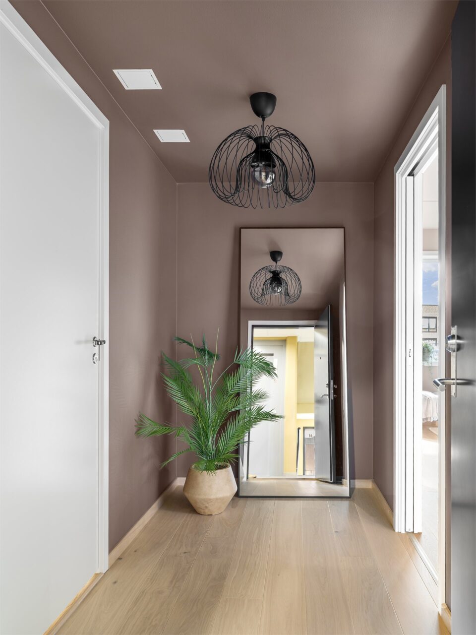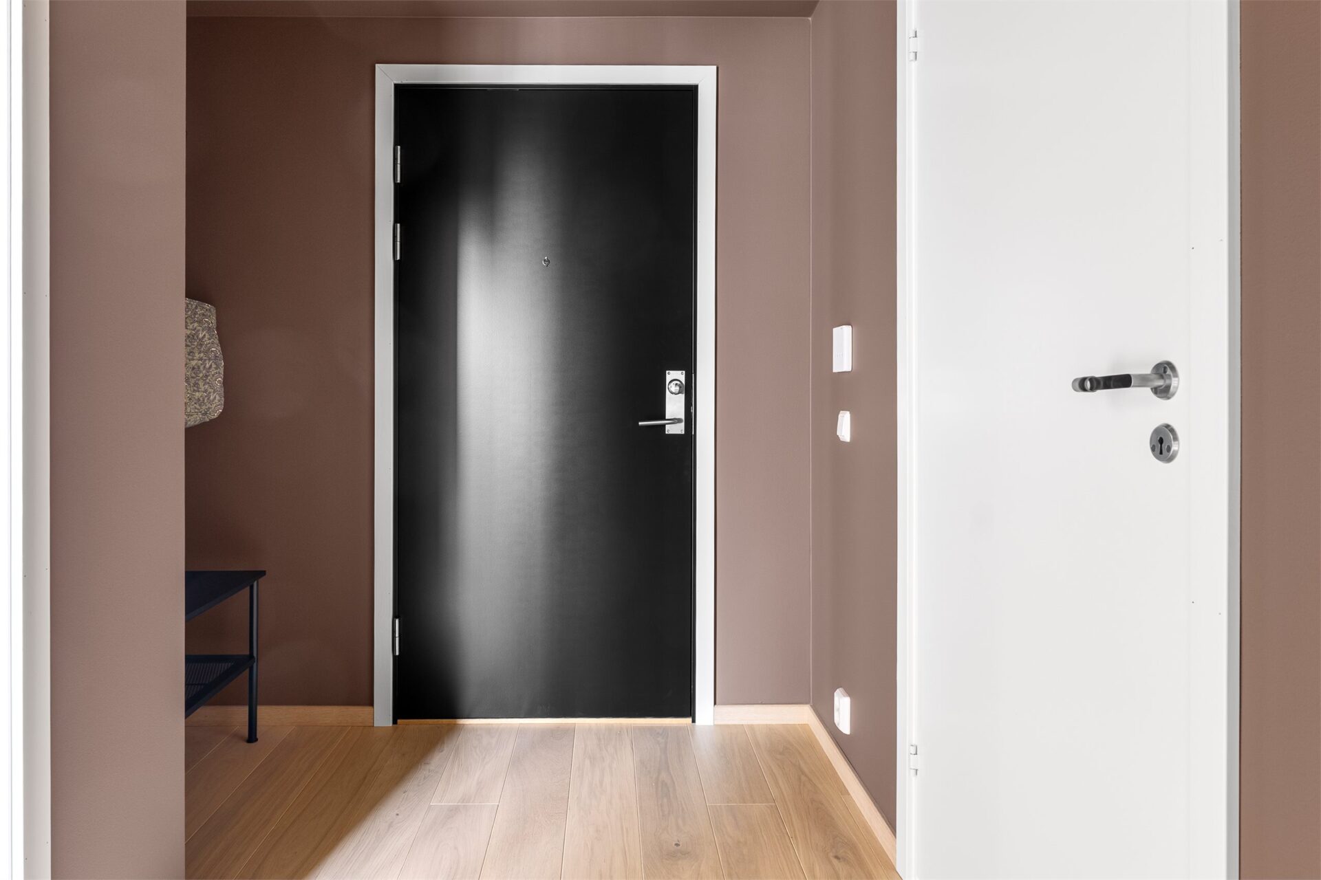 Leiligheten har en entré med 1-stavs parkett er gjennomgående i leiligheten med unntak av baderom. Det leveres komplett porttelefonanlegg, 2-veis tale og fjernåpning av hovedinngangsdør fra hver leilighet. Lampepunkt i tak med bryter.