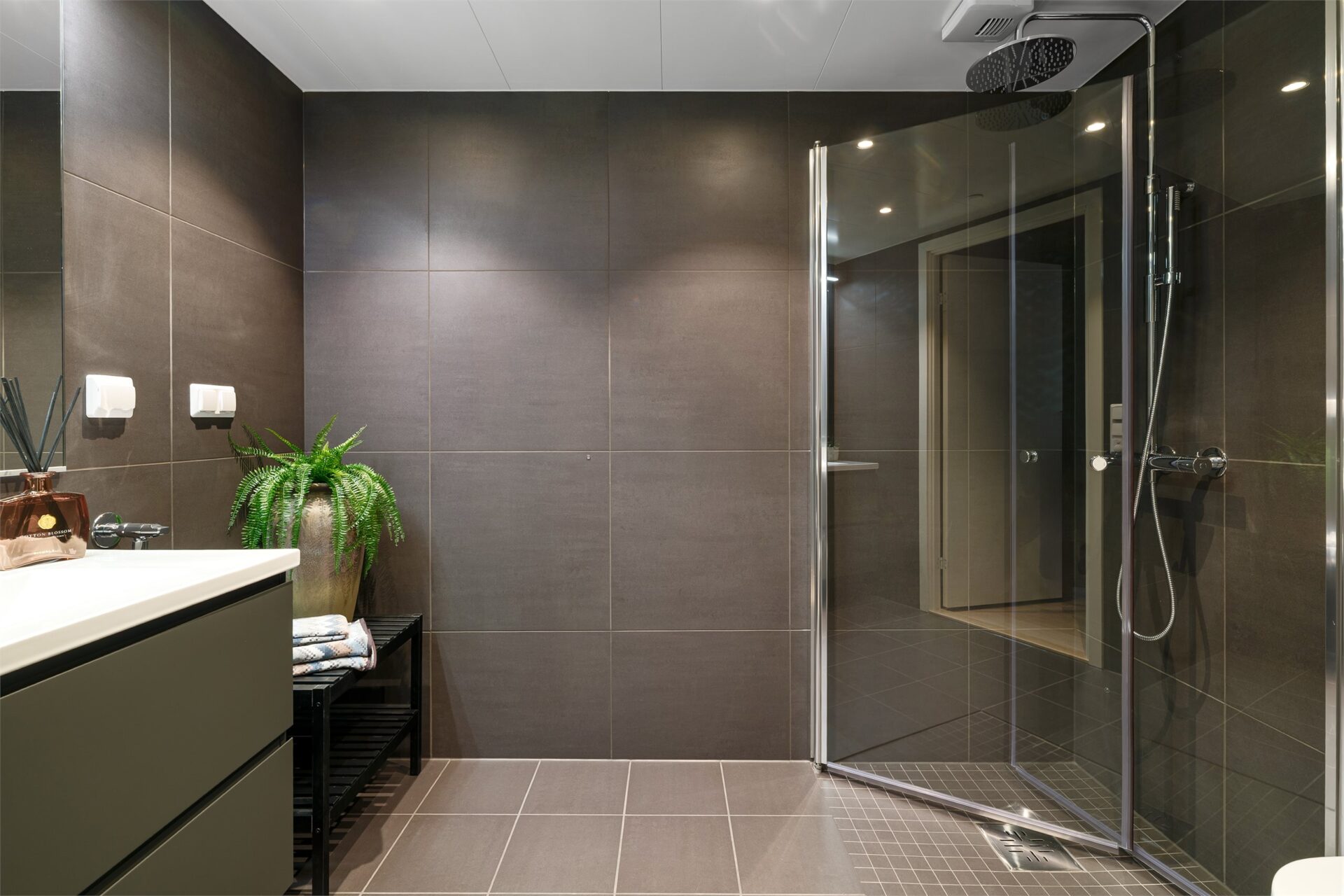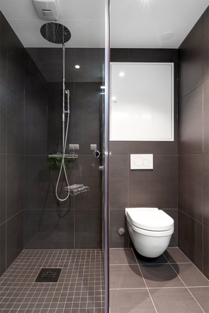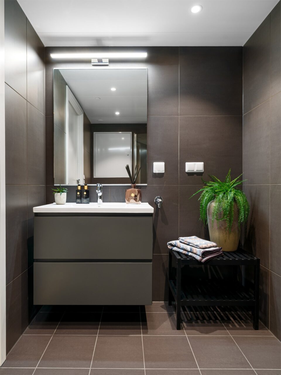 Leiligheten har et innbydende bad på ca. 4,4 m². Det leveres et stilrent og minimalistisk servantskap skuffer.