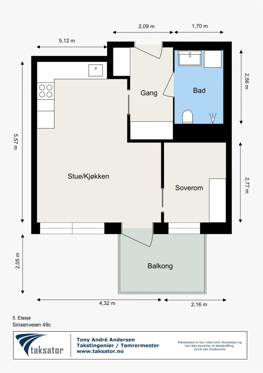 Arealet er beregnet ut fra Norsk standard NS 3940:2023. BRA-i: Internt arealet innenfor boligens omsluttende vegger, inkludert sjakt. BRA-e: Eksternt areal som boligen har eksklusiv bruksrett til, men som ikke ligger i boligen, f.eks. kjellerbod. BRA-b: Areal for innglasset balkong med veggareal. Total BRA = Summen av BRA-i, BRA-e og BRA-b. TBA er areal på terrasse og balkong. Arealet oppgis ved salg, men inngår ikke i BRA. Oppgitt romareal er netto romareal. De oppgitte arealer er å betrakte som cirka-arealer.