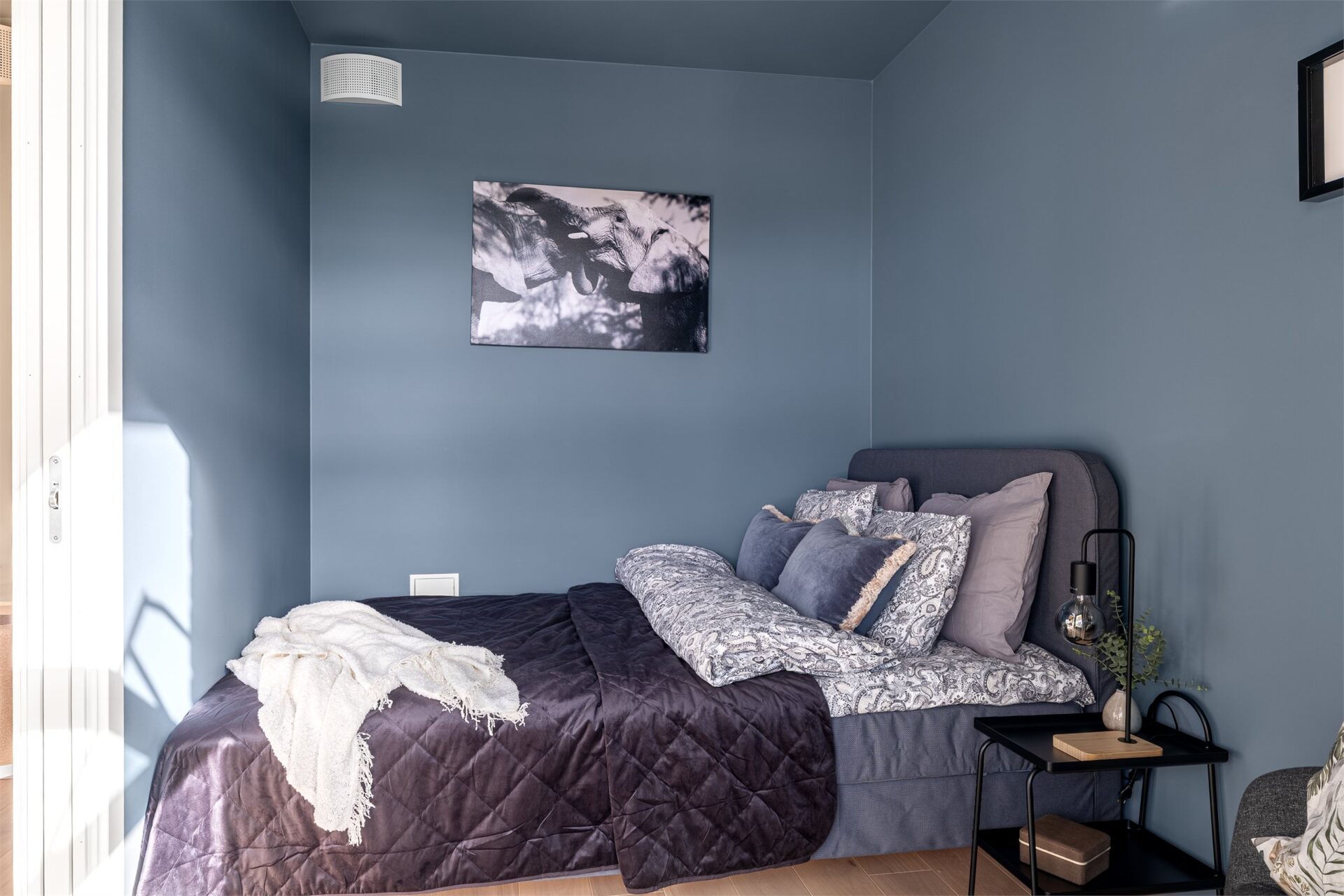 Leilighetens soverom er på 6 m² og har plass til garderobeløsning i tillegg til dobbeltseng.