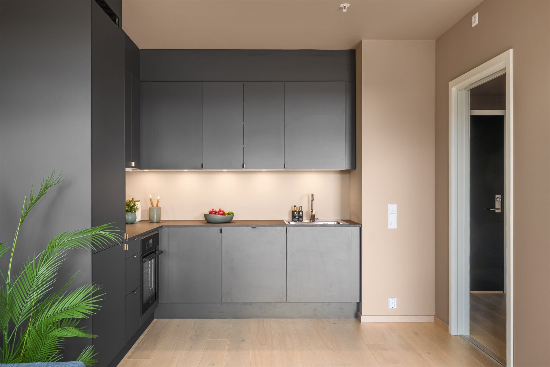 Moderne 2-roms, god takhøyde og store vindusflater. Sørvestvendt balkong på ca. 6 m². Balansert ventilasjon sørger for godt inneklima og lave kostnader til oppvarming. Leiligheten har en svært sentral beliggenhet med kort vei til butikker, restauranter og kollektivtransport.