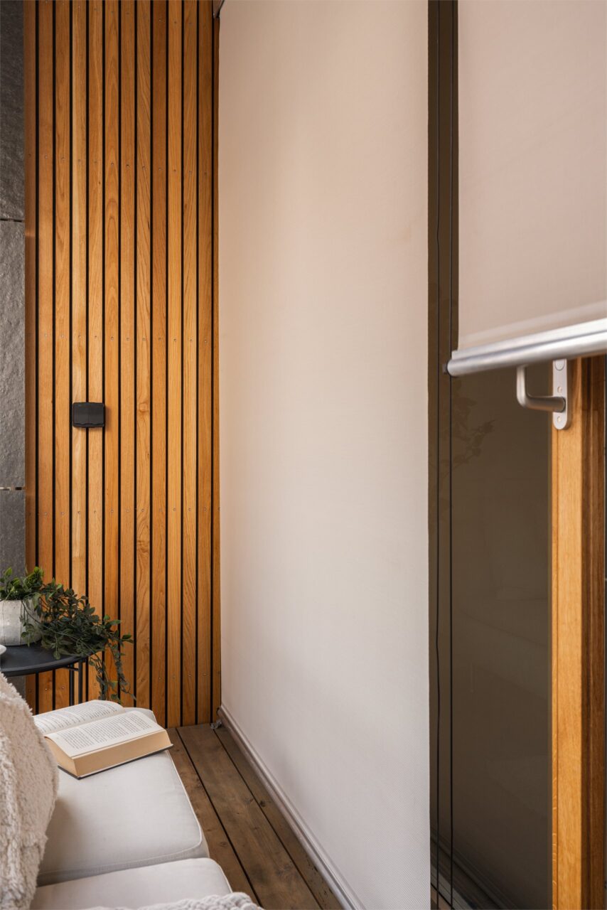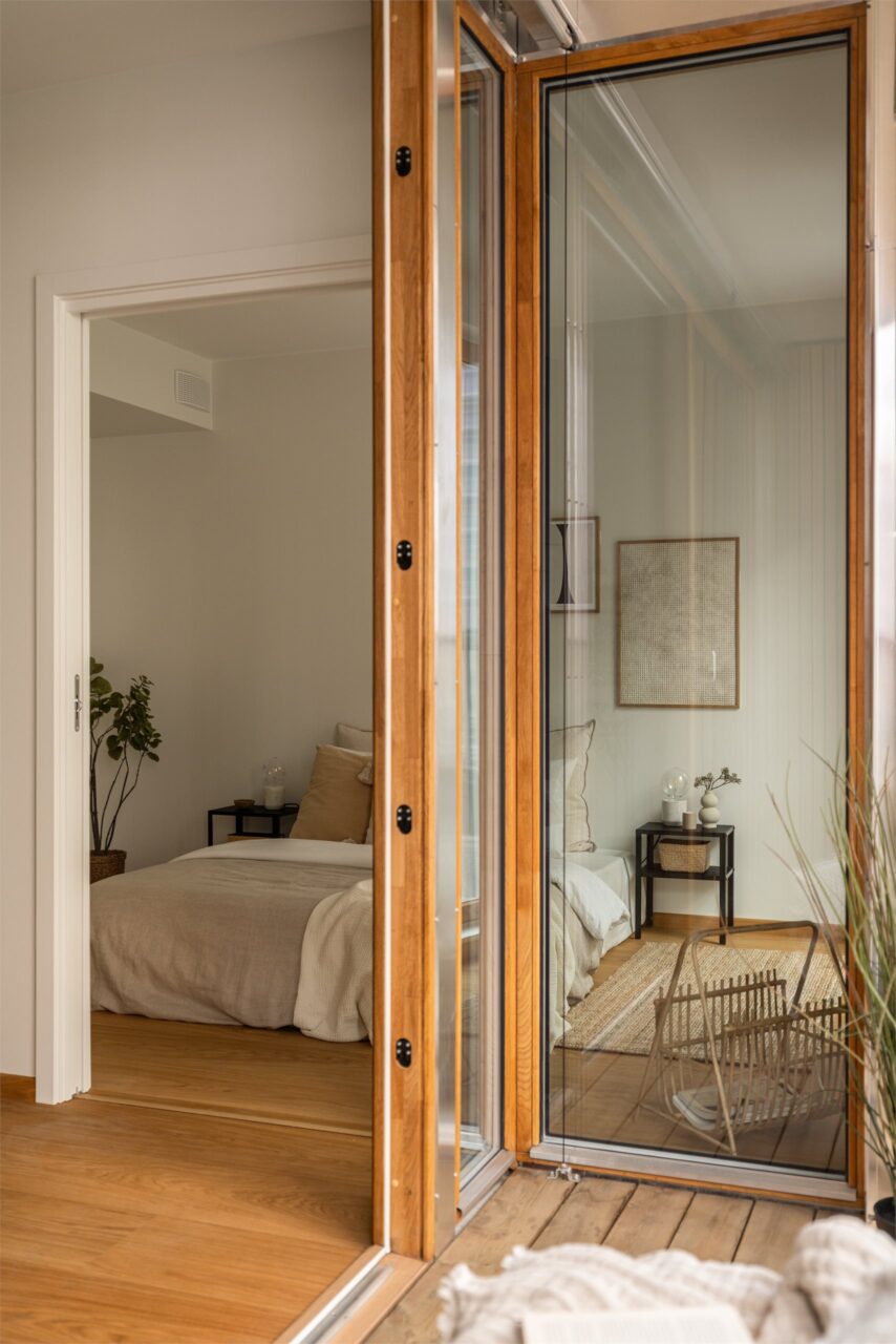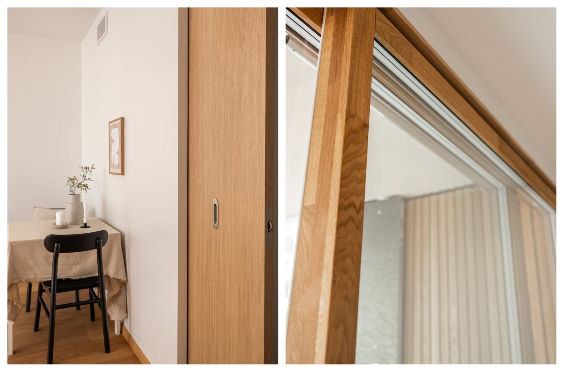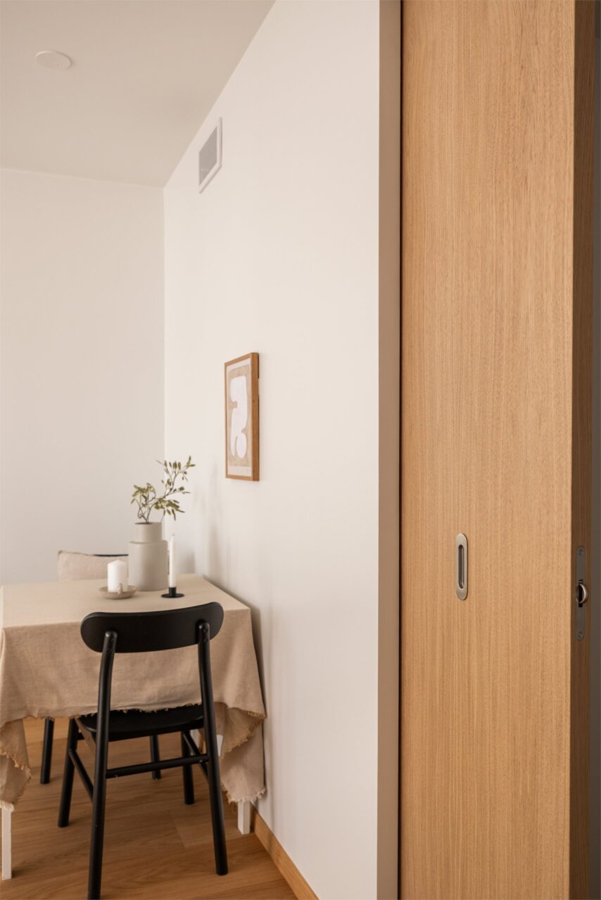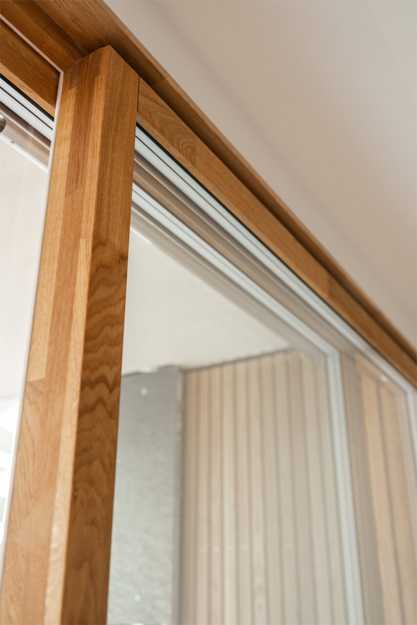 Bruken av eik er gjennomgående i boligen. Mellom gangen og stue er det en lekker skyvedør i finert eik fra Knudsen dørfabrikk som står i stil med parketten.