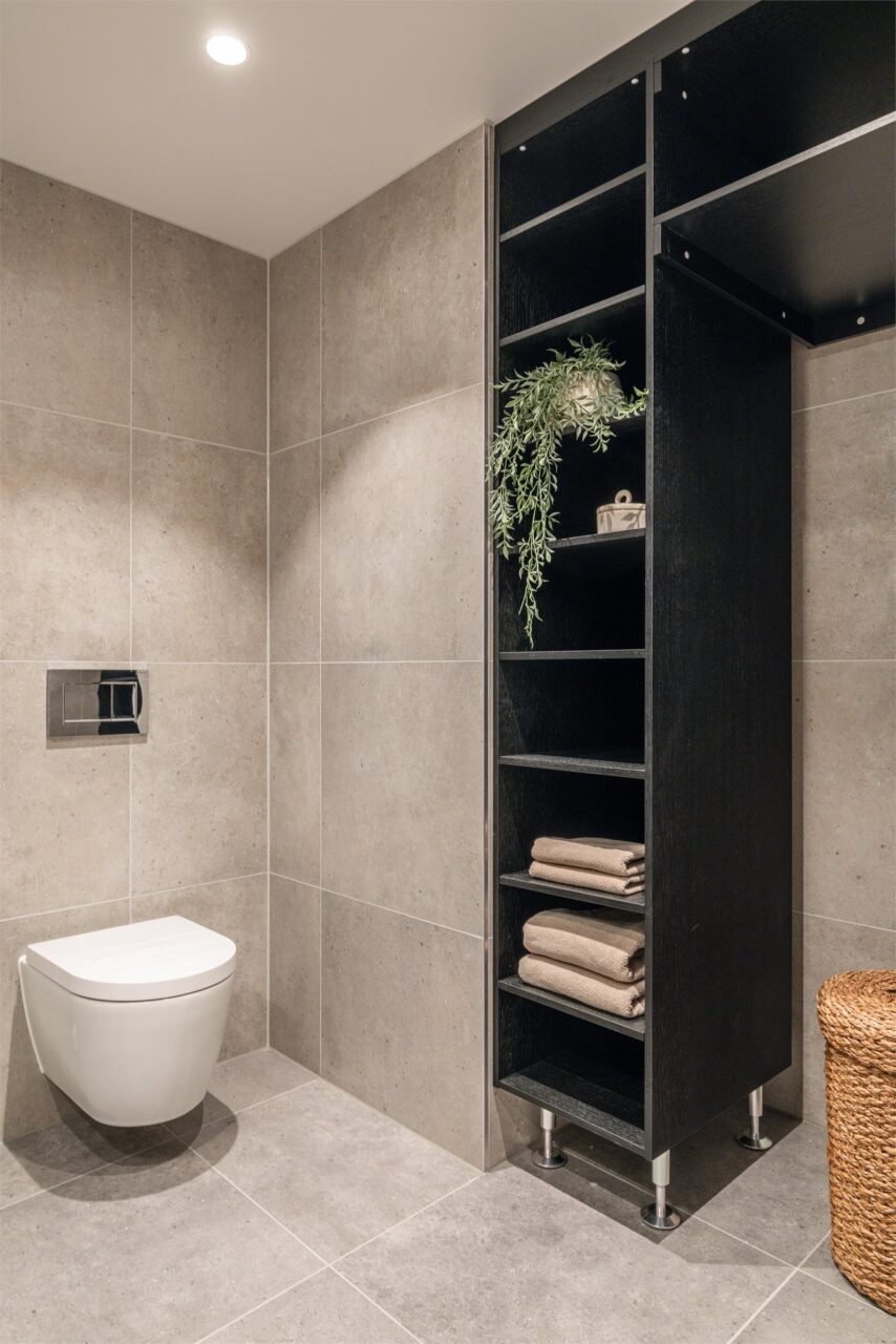 Veggmontert toalett med innebygget sisterne og toalettsete med soft-close.