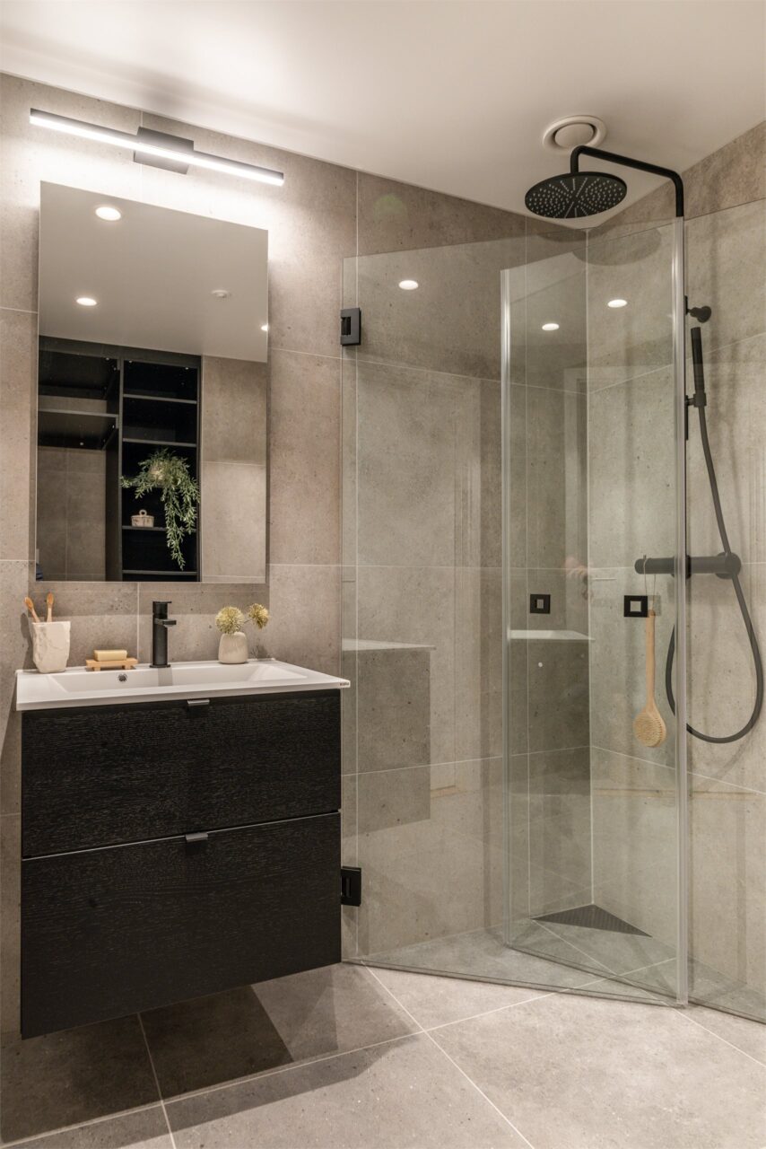 Regnfallsdusj og svingbare dusjdører som er plassbesparende.