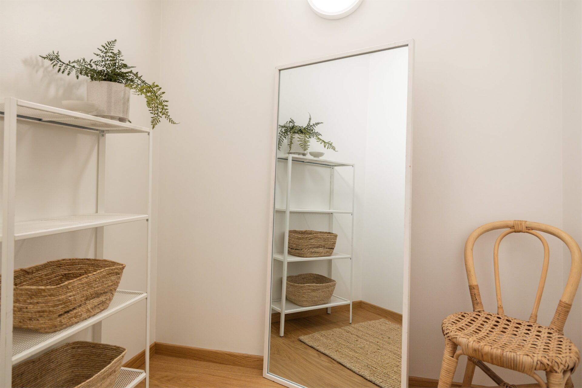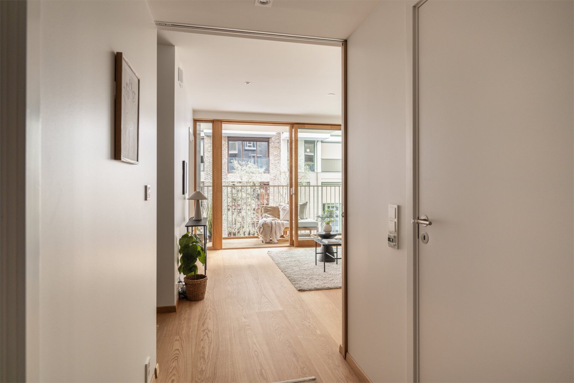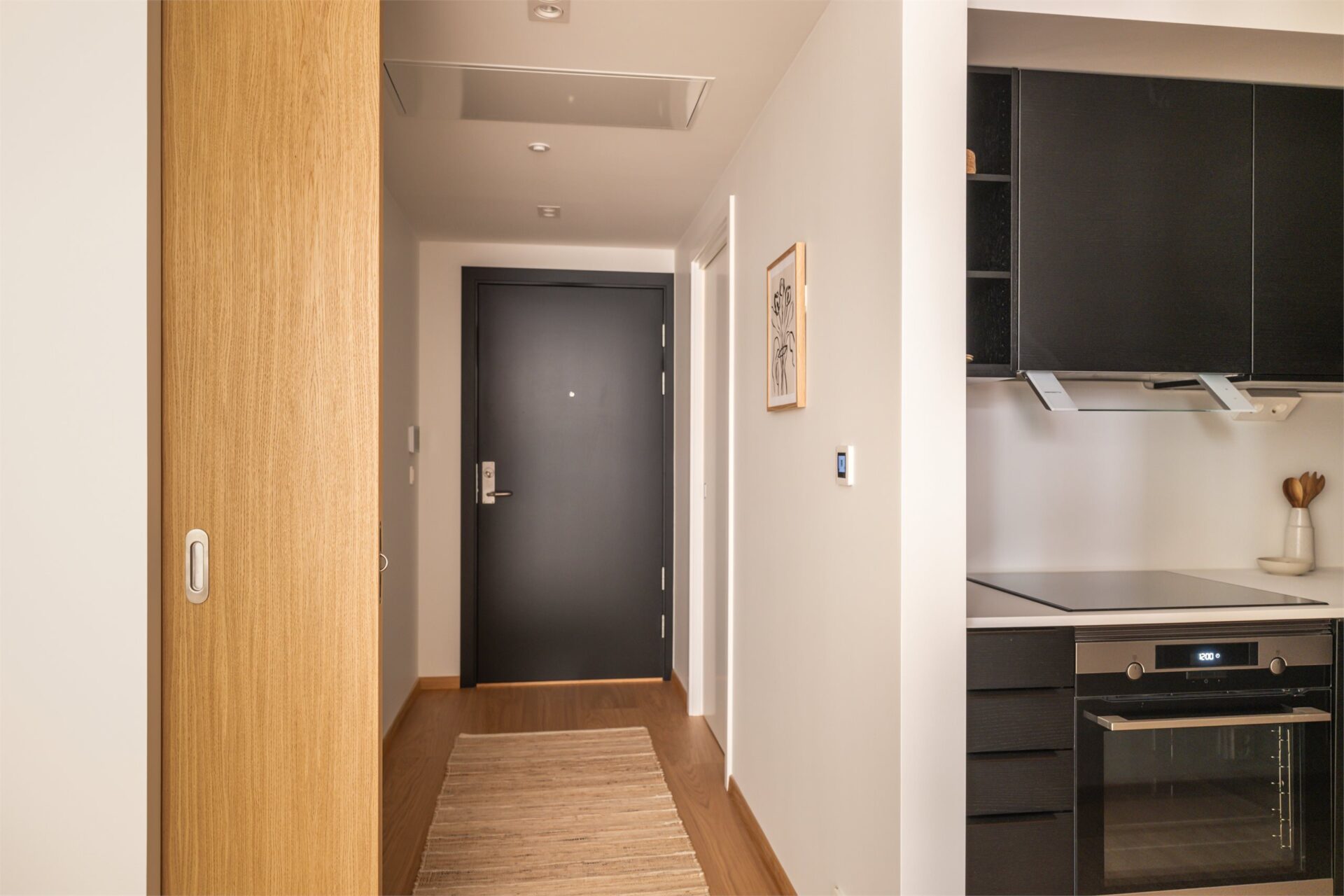 Leiligheten har en lys gang på ca. 3,8 m². Det er en lekker én-stavs eikeparkett på gulv. I himling er det downlights. På vegg er det tablå for døråpning/videocalling. Utenfor hver leilighet er det også i tillegg en ringeknapp til leiligheten.
