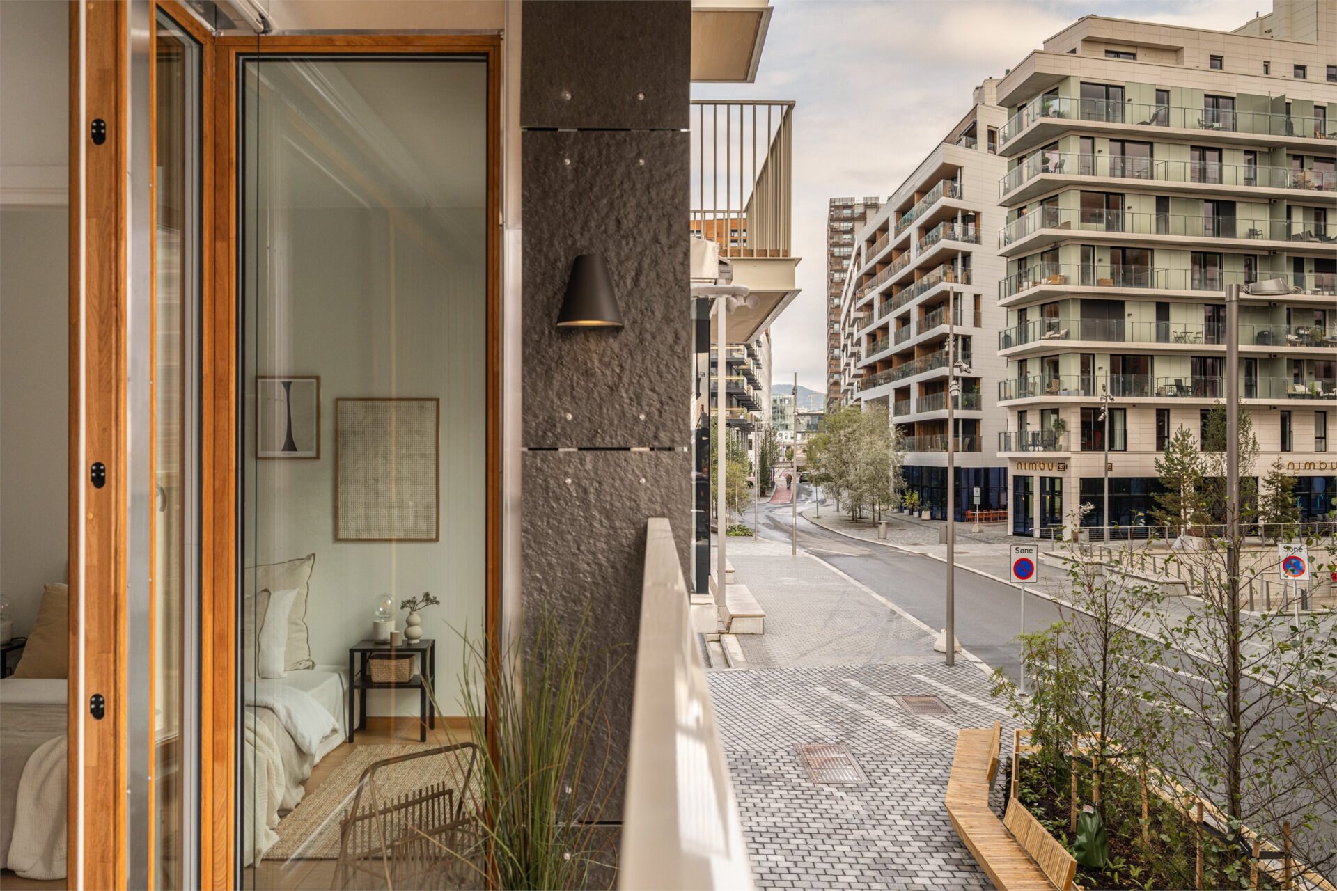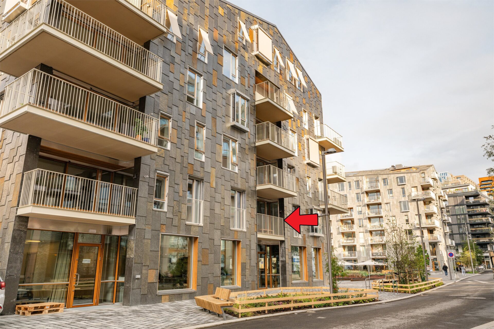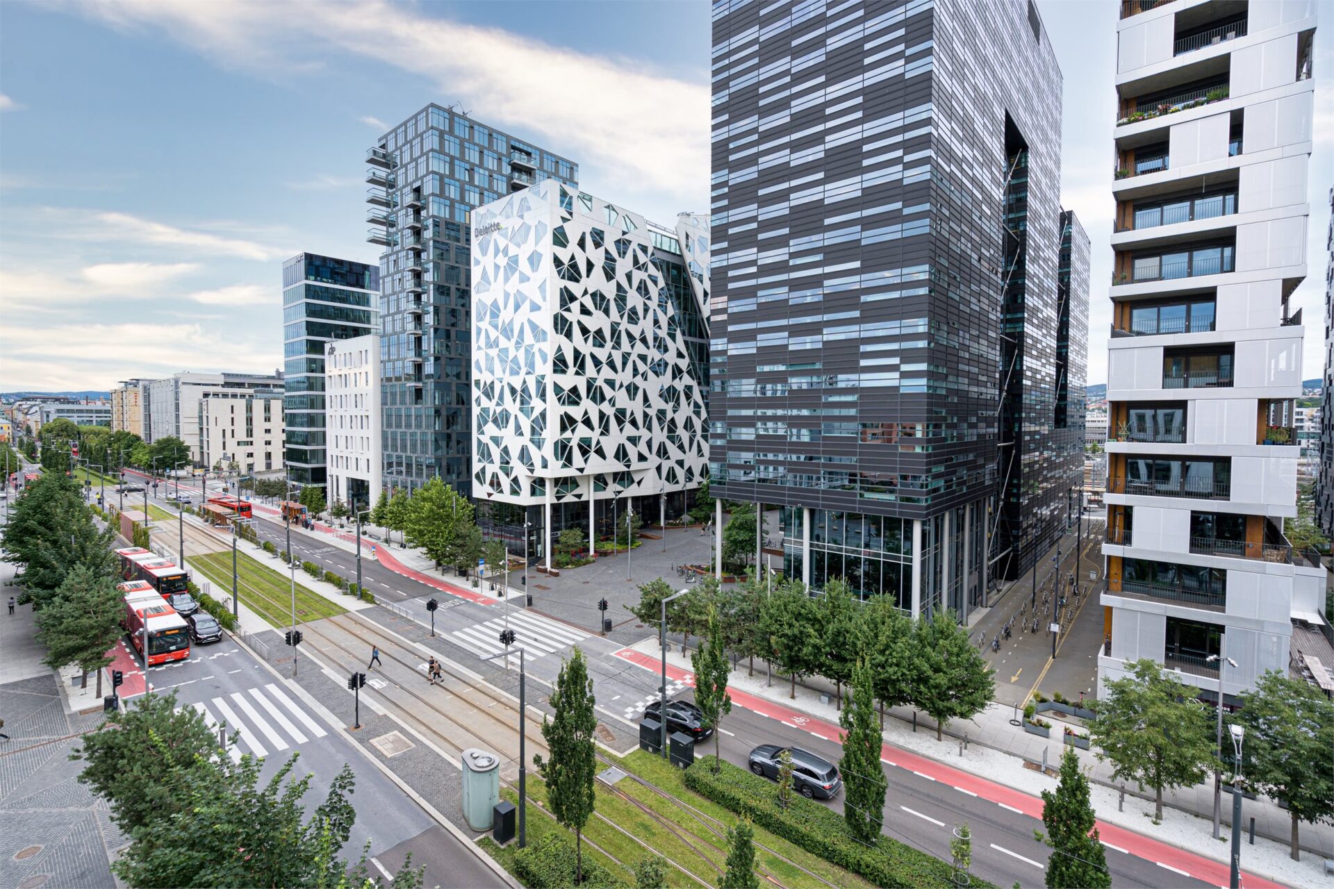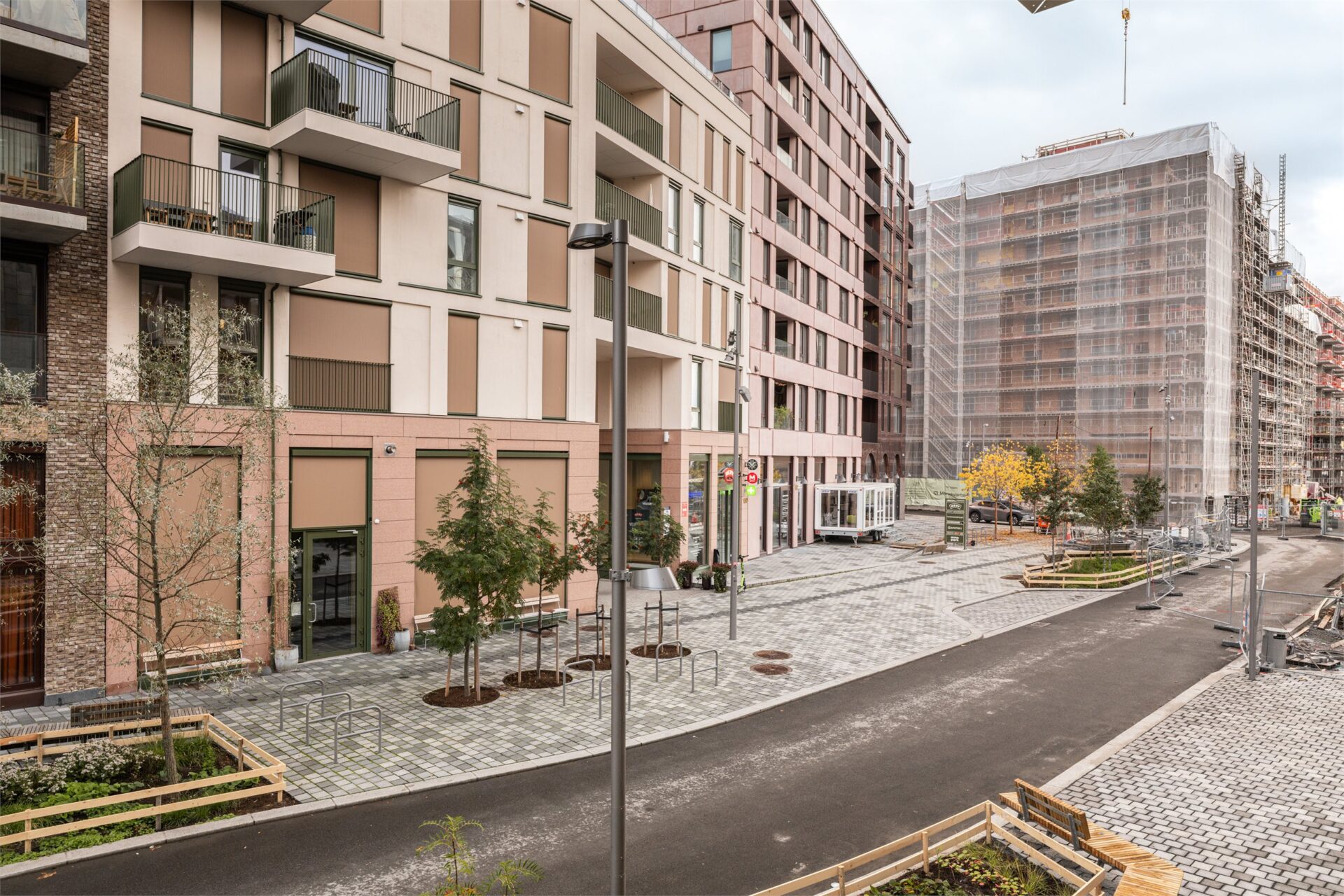 Det er verdt å nevne at det er en miljøgate mellom byggene. Her tilrettelegges det for syklister og fotgjengere med frodig vegetasjon, samt torg med uteservering og butikker.