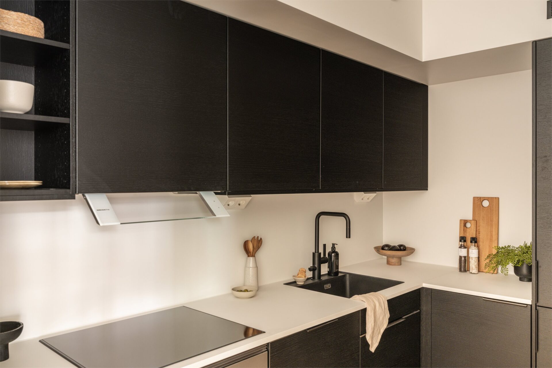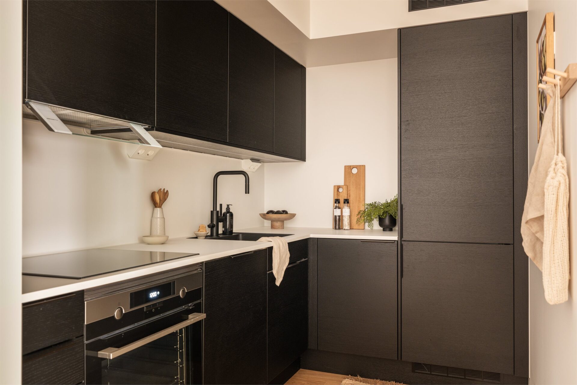 Det er et stilrent kjøkken fra Sigdal med sorte fronter.