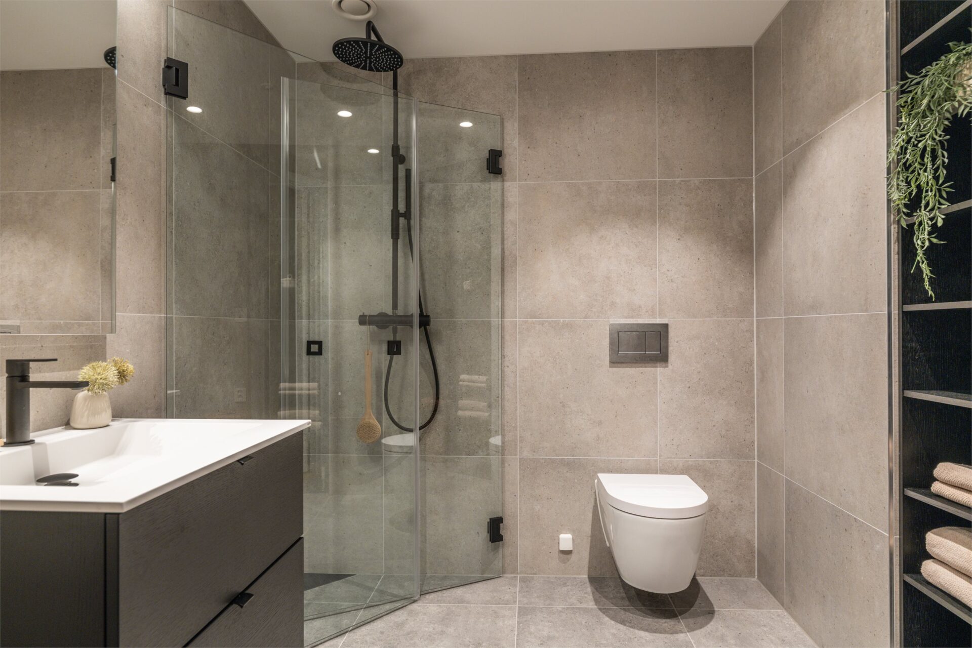Det er store fliser 60x60cm på både gulv og vegg.