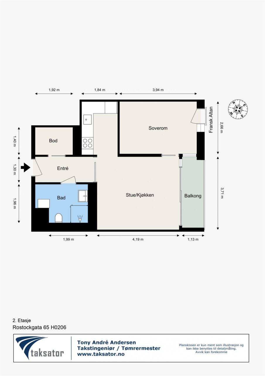 Arealer er hentet fra utført arealoppmåling av takstmann. Arealrapport ligger vedlagt i salgsoppgaven. Arealet er beregnet ut fra Norsk standard NS 3940:2023. BRA-i: Internt arealet innenfor boligens omsluttende vegger, inkludert sjakt. BRA-e: Eksternt areal som boligen har eksklusiv bruksrett til, men som ikke ligger i boligen, f. eks. kjellerbod. BRA-b: Areal for innglasset balkong med veggareal. Total BRA = Summen av BRA-i, BRA-e og BRA-b. TBA er areal på terrasse og balkong. Arealet oppgis ved salg, men inngår ikke i BRA. Oppgitt romareal er netto romareal. De oppgitte arealer er å betrakte som cirka-arealer.