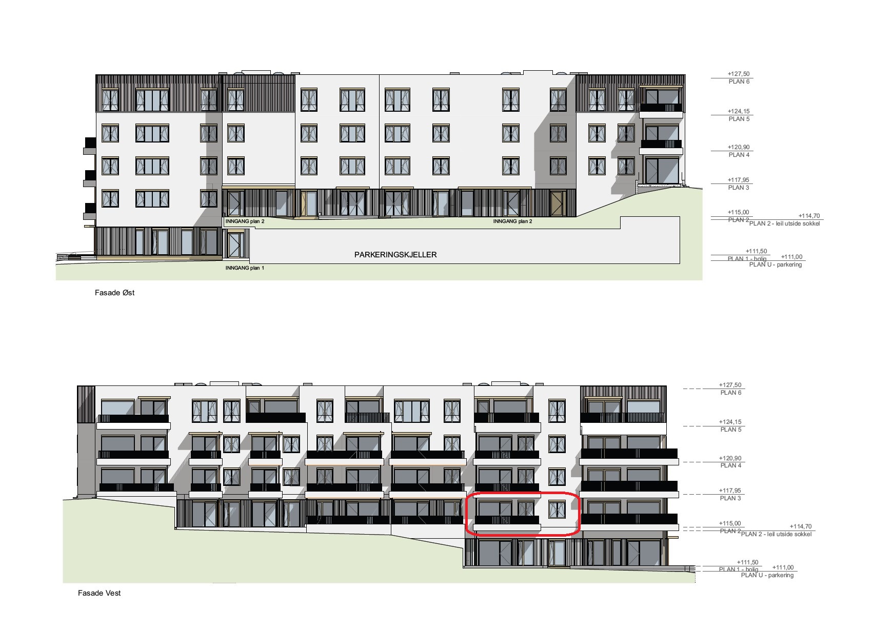Parkeringsanlegget for Landåstoppen vil være ett sammenhengende anlegg. Innkjøring til garasjeanlegget vil være fra kommunal vei mellom hus A1 og A2, se utomhusplan. Det vil også bli etablert ca. 4 p-plasser på terreng ved innkjøring til garasjeanlegg. Disse planlegges til å være forbeholdt hjemmetjenesten til Asker kommune i tråd med regulerings-planen.