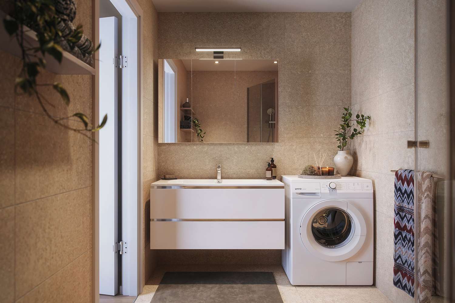 Utover utførte tilvalg, så leveres leiligheten med interiørkonseptet «Den lyse». Denne stilretningen har de lyseste tonene av de tre. Lyse farger reflekterer sollyset, gir luftige og lette rom, og kan få et rom til å virke større. Dette er kanskje den aller mest fleksible stilen av de tre. Flis til badegulv er planlagt i størrelse 60x60cm, og flis til vegg i 60x30cm. Flis i dusjnisje blir 10x10cm.