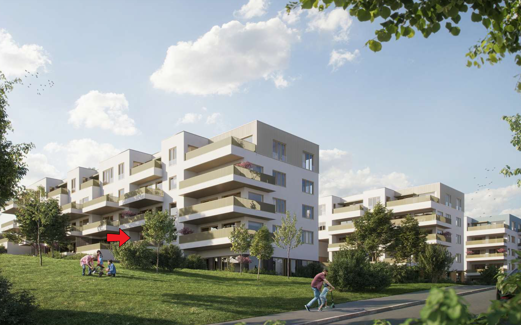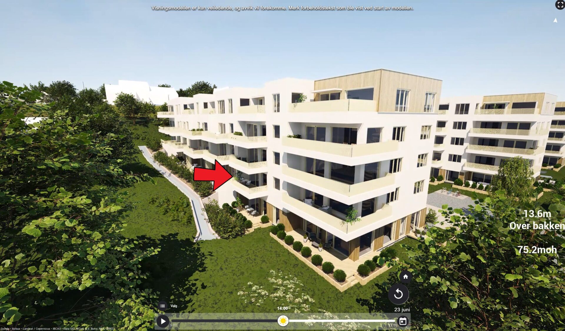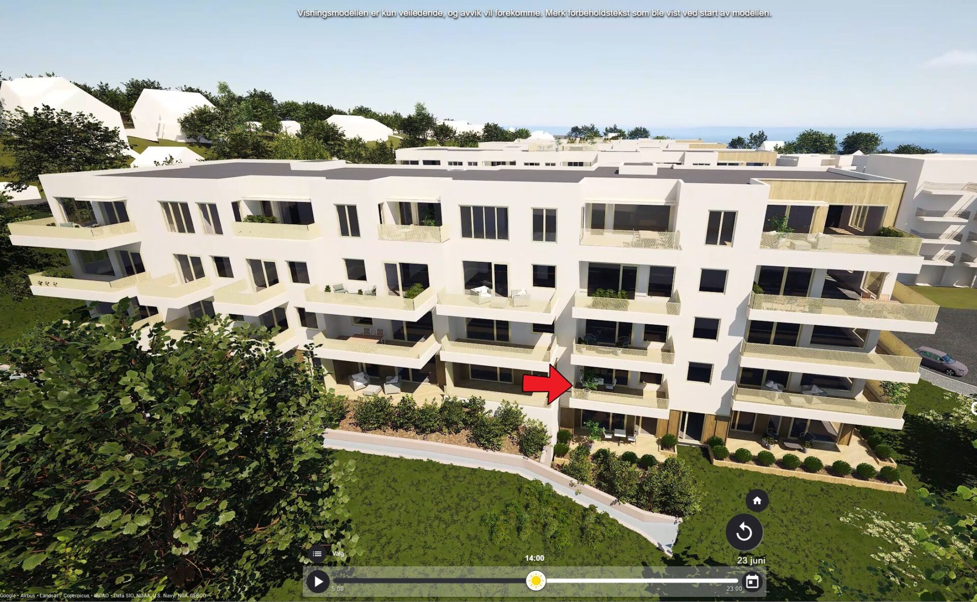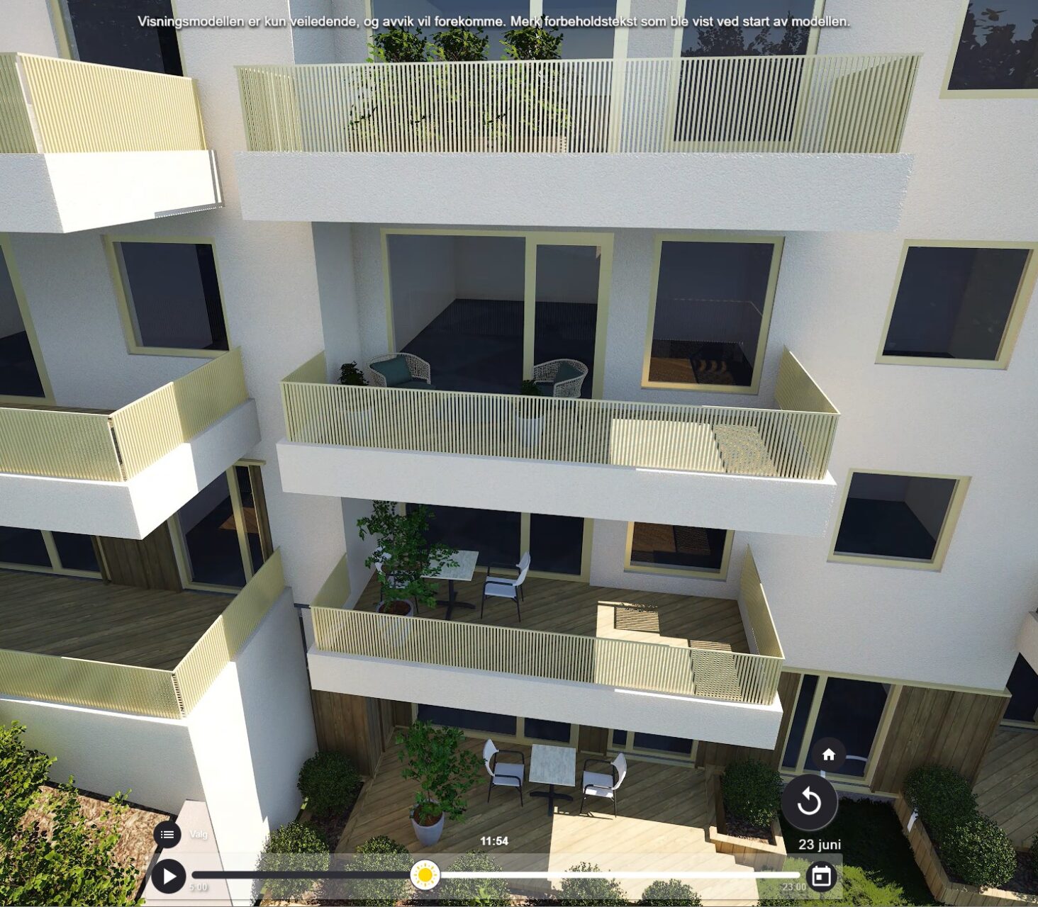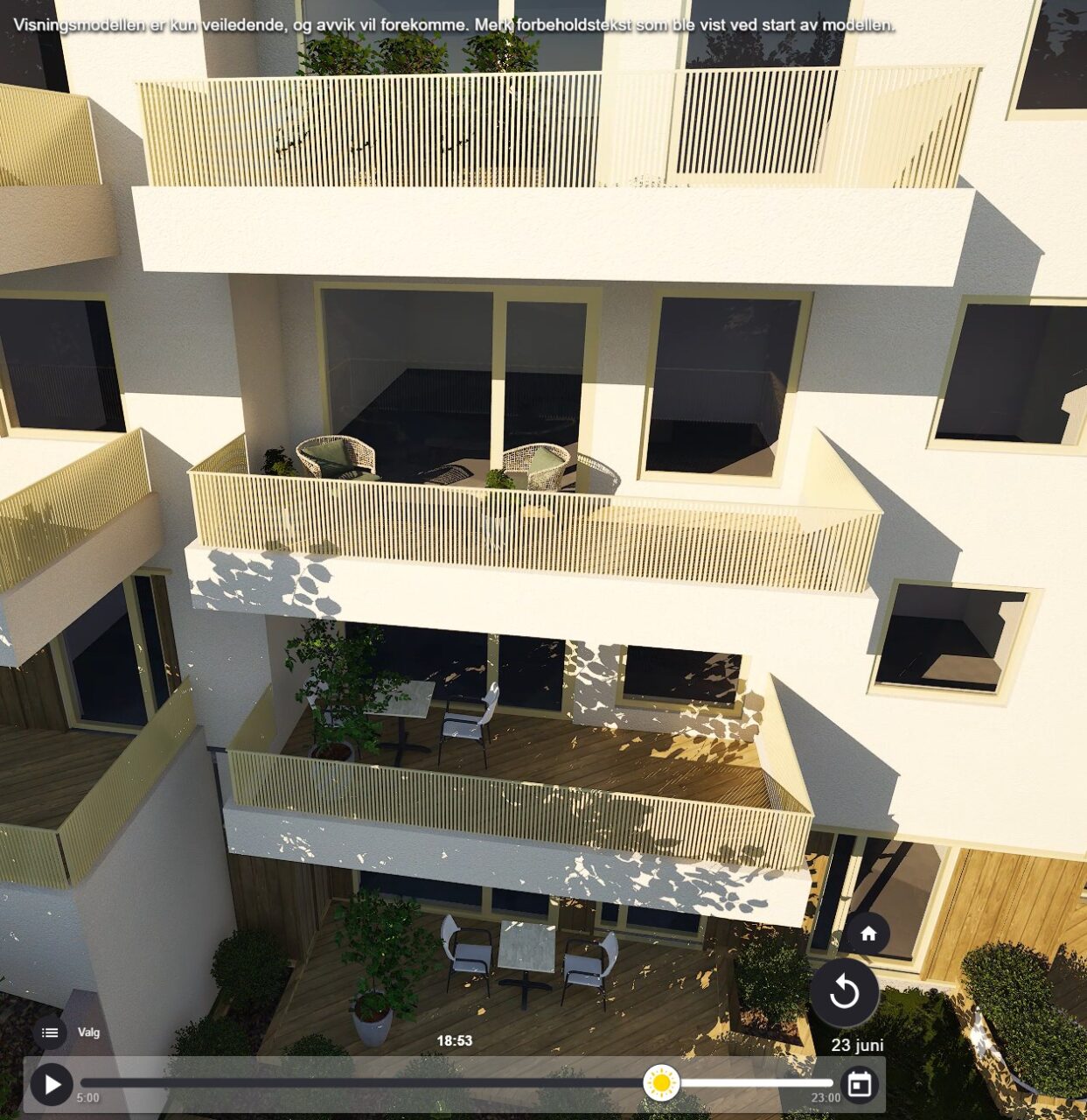 Illustrasjonene er ment for å gi et inntrykk av prosjektet. Solstudie og utsikt kan avvike noe fra virkeligheten, og trær kan ha andre høyder enn gjengitt. Bygningene og utomhusområdet er illustrasjoner av planene, og avvik fra endelig leveranse vil forekomme.