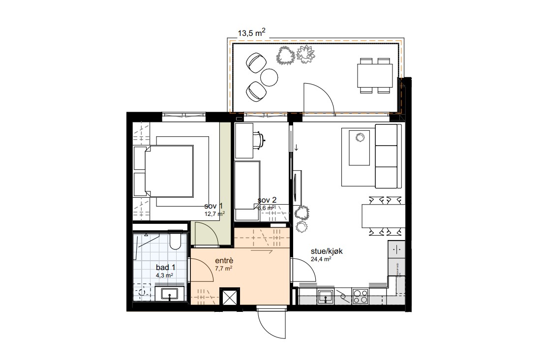 BRA-i: Entré, bad, 2 soverom og stue med åpen kjøkkenløsning.