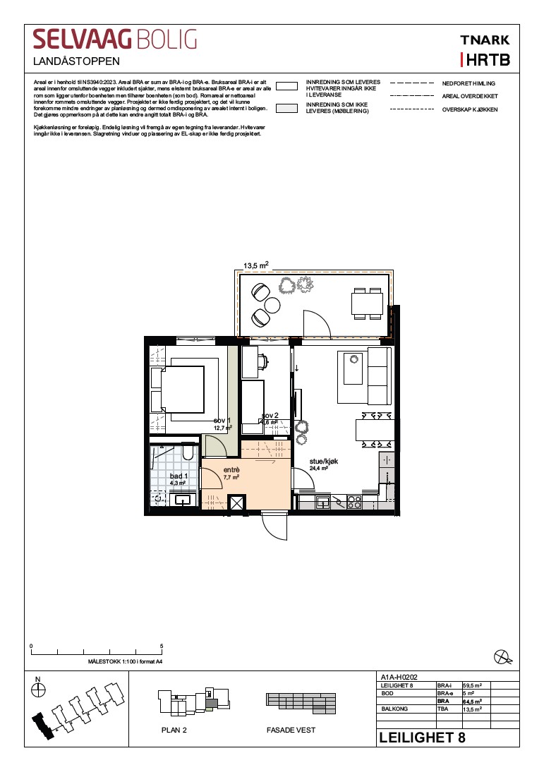Alle arealer er hentet fra utbyggers plantegning. Arealet er angitt i henhold til NS3940:2023. BRA-i er bruksarealet av en boenhet som ligger innenfor omsluttende vegger, inkl. innvendige vegger, sjakter, søyler o.l. BRA-e er bruksarealet av alle rom som ligger utenfor boenheten, men som tilhører denne. BRA-b er arealet av eventuell innglasset balkong. BRA er summen av BRA-i, BRA-e og BRA-b. TBA er arealet av terrasser, åpne balkonger og uteareal tilknyttet boenheten. På tegningene kan det også være angitt et romareal som er nettoarealet innenfor rommets omsluttende vegger. Det tas forbehold om mindre avvik for de oppgitte arealer, da beregningene er foretatt på tegninger. Angitte arealer på plantegning er basert på foreløpig beregninger forut for detaljprosjektering. Selger forbeholder seg retten til å foreta omdisponeringer av arealet internt i boligen. Det gjøres oppmerksom på at dette kan endre angitt totalt BRA-i, og dermed også BRA.