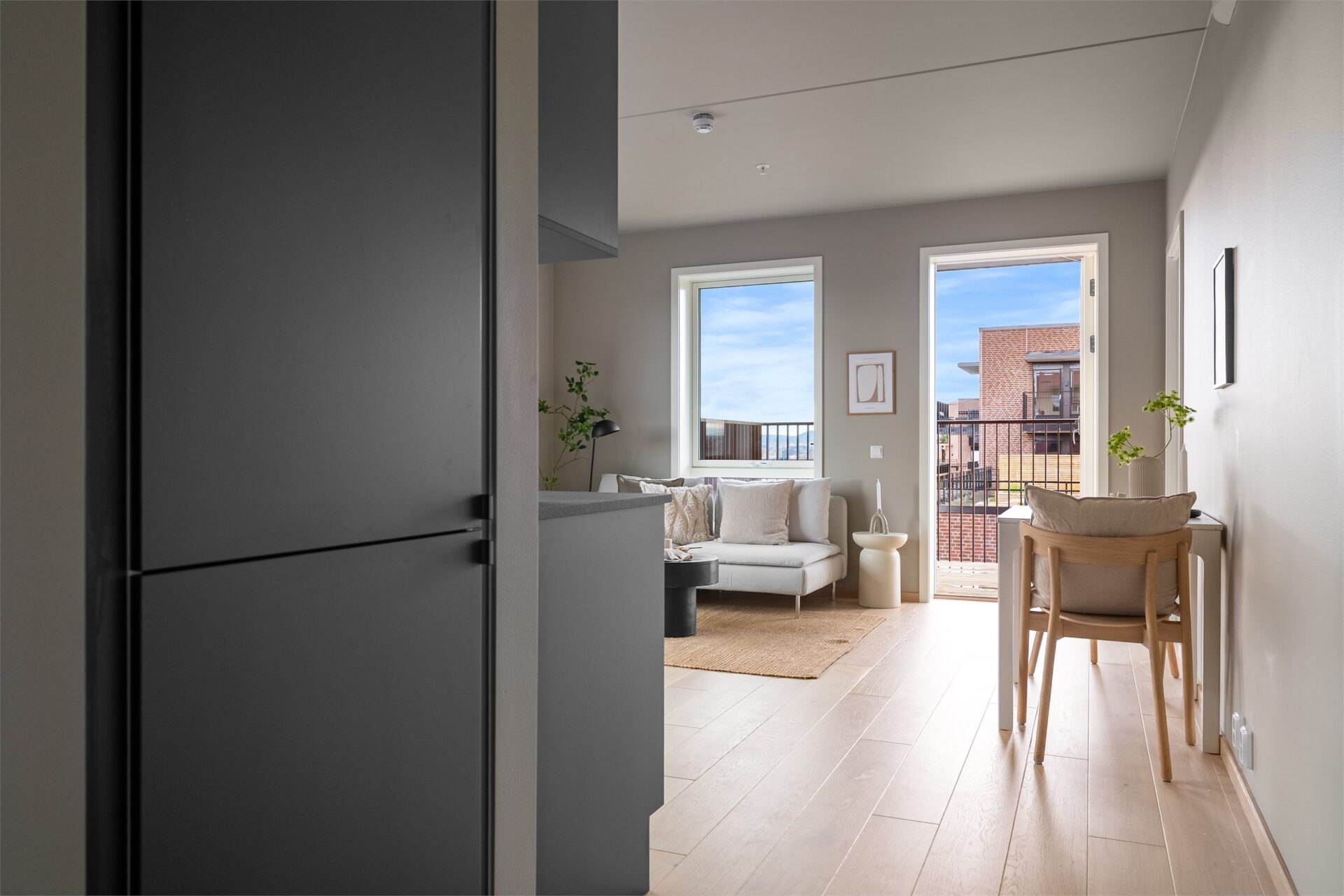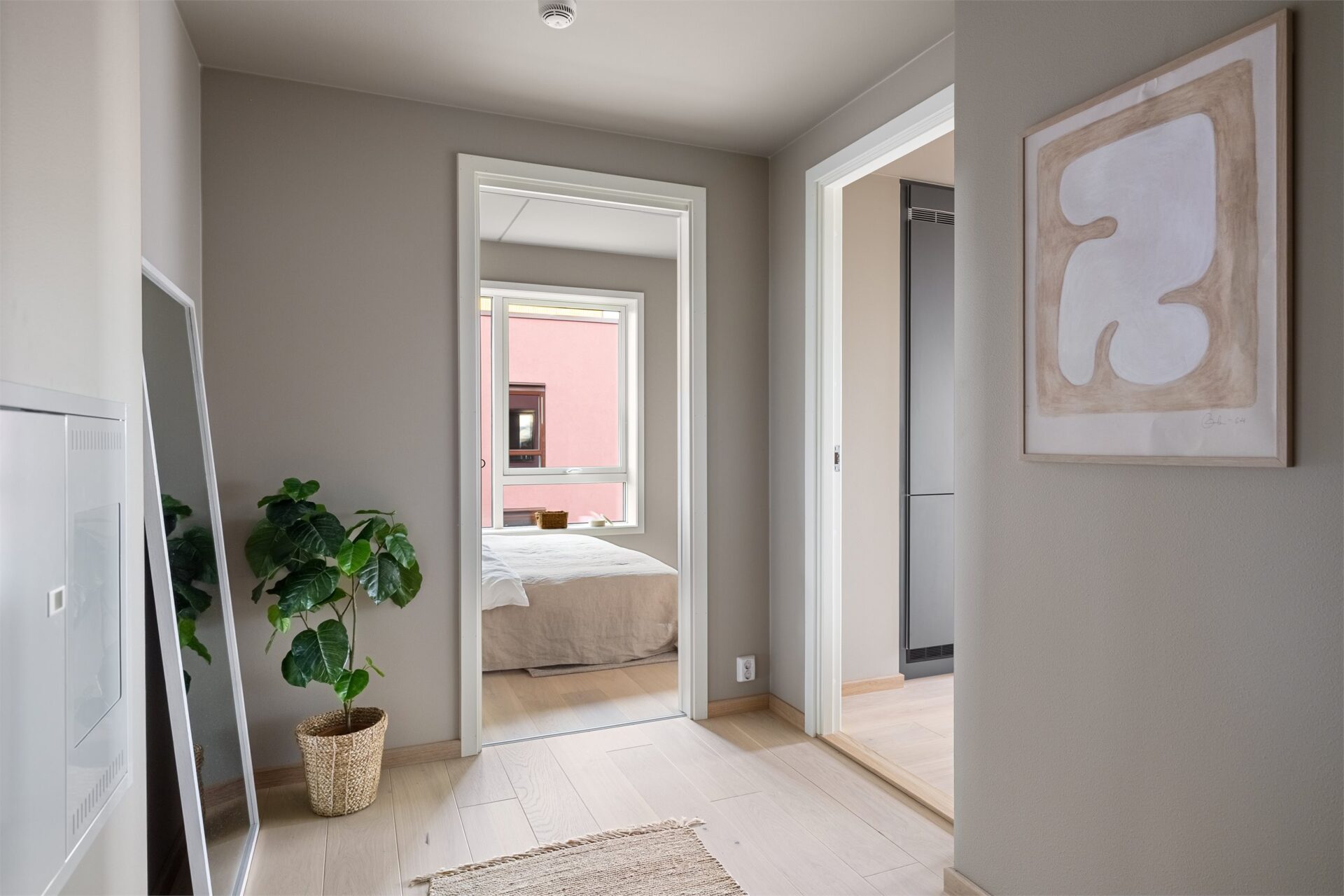 Innenfor inngangsdøren møtes man av en entré på ca. 6,4 m². Det leveres en pen 1-stavs parkett på gulv. Audio porttelefon på vegg. Lampepunkt i tak med bryter. Det er malt i «Kalkgrå» i hele leiligheten som står i stil med resten av fargene i leiligheten.
