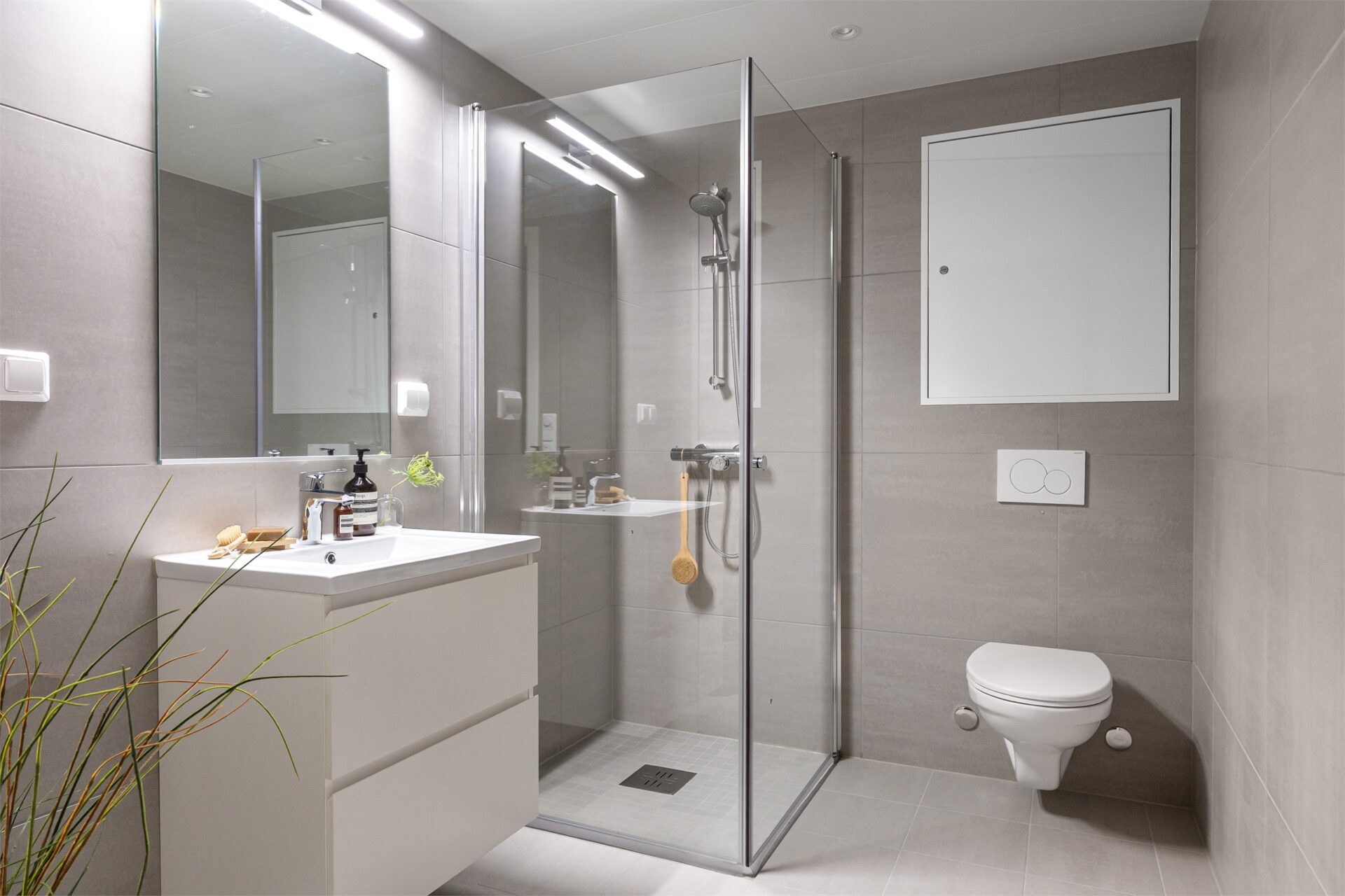 Gulvfliser 30×30 cm, og 5×5/10×10 i dusj. Fug med farge tilsvarende flis. Nedsenket dusjsone.