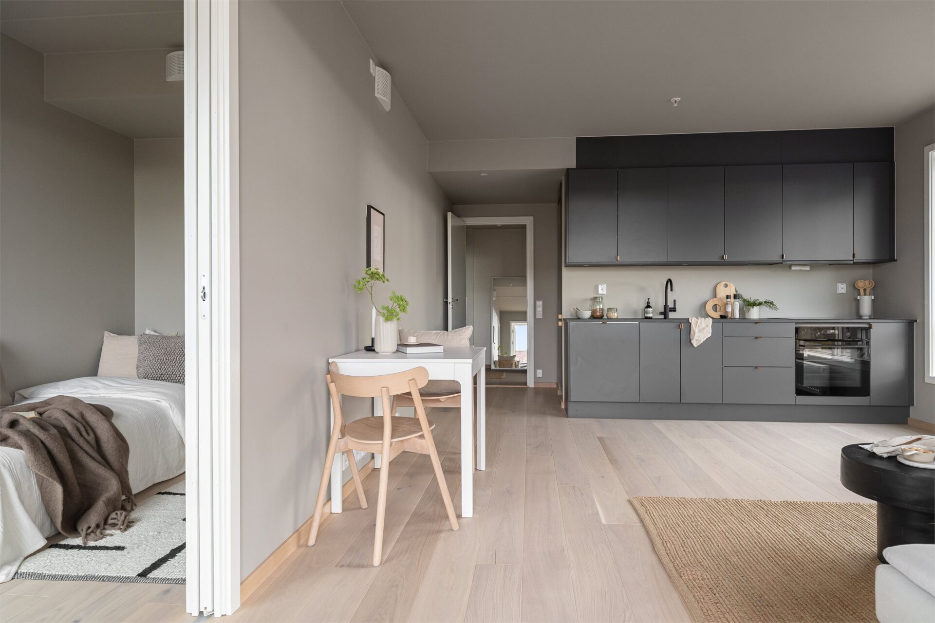 BRA-i: Entré, bad, 2 soverom og stue med åpen kjøkkenløsning.