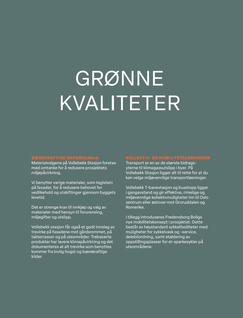 Materialvalgene på Vollebekk Stasjon foretas med omtanke for å redusere prosjektets miljøpåvirkning. Vi benytter varige materialer, som teglstein på fasader, for å redusere behovet for vedlikehold og utskiftinger gjennom byggets levetid. Det er strenge krav til innkjøp og valg av materialer med hensyn til forurensing, miljøgifter og utslipp. Vollebekk stasjon får også et godt innslag av trevirke på fasadene mot gårdsrommet, på takterrasser og på uteområder. Trebaserte produkter har lavere klimapåvirkning og det dokumenteres at alt trevirke som benyttes kommer fra lovlig hogst og bærekraftige kilder.